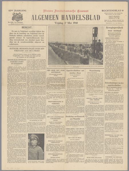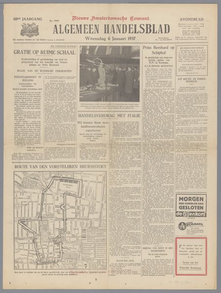Curator: Here we have a striking piece of graphic art, an edition of the "Algemeen Handelsblad," a Dutch newspaper possibly from September 29, 1939. It’s primarily typography and photography combined in a startling page layout. Editor: My immediate reaction is a sense of stark historical gravity. The black and white photography and dense text create a claustrophobic feeling. It evokes a particular moment in time… perhaps a time of crisis? Curator: Indeed. The newspaper's layout reveals a rigid structure. Notice the columns and how each story is compartmentalized, creating a clear visual hierarchy. This design suggests a desire to present information with order and authority. We can analyse this using structuralist theory, noting the binary oppositions at play: order versus chaos, information versus noise. Editor: And that authority is key, I think, to understanding the impact of this historical artifact. Looking closer, we see headlines referring to Moscow and Berlin striving to end the “state of war”. The Molotov-Ribbentrop Pact was signed just weeks before this edition. This newspaper, while seemingly objective in its presentation, participated in the construction of that historical moment. The pact was a betrayal of leftist movements everywhere, presenting the Soviets and Stalin in a suspicious, and potentially dangerous, light. Curator: Precisely. Further emphasizing order is the careful selection of font types. The headline font communicates a sense of importance, while the body text is clear and functional, prioritizing readability. We must ask, what does each stylistic choice evoke and how does it reinforce the message of the page? Editor: I see it somewhat differently. The choice to display these announcements in such a way reinforces existing structures of power, serving specific state interests during this precarious geopolitical moment. The paper operates as an organ for distributing the accepted narratives of the period. The "page thumbnail," the layout – these elements should encourage the critical examination of its power dynamics, particularly concerning its historical role in shaping public perception of Stalinist Russia during the build up to WWII. Curator: These aesthetic decisions work together to project an aura of truth and reliability. Editor: It forces us to question its intentions. After all, whose truth is being represented? It presents us with a curated reality designed for mass consumption. Curator: Precisely the effect newspaper aims to make through calculated semiotic design. Editor: A stark and disquieting echo from the past. Curator: Indeed, a valuable lesson in critical seeing and understanding designed intent.