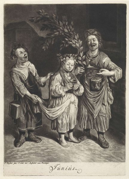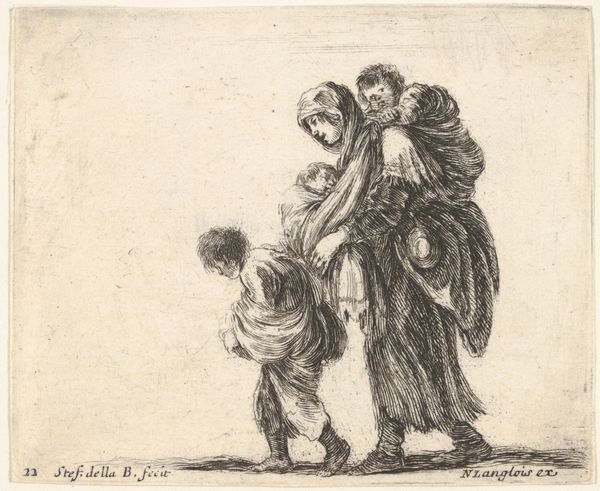 Curator: Look at this engaging etching. It's called "Menghina leaving the garden with a basket filled with herbs and encountering Cacasenno." It’s by Giuseppe Maria Crespi and dates to somewhere between 1705 and 1715. Editor: The stark lines of the etching give it such a clear, immediate feel. The way the figures are posed, it almost feels like a stage. The tonal range may be narrow but effective at creating emphasis. Curator: It’s part of a series based on the popular folk tale of Bertoldo, Bertoldino, and Cacasenno. Crespi was very interested in portraying everyday life and the lives of the lower classes, so these characters from the comedic tradition were ripe subjects for him. Editor: Observe the composition itself. The towering figure of Menghina creates an imbalance, right? Especially against the much smaller Cacasenno. The diagonal line created from the lower left to the upper right corners of the etching reinforces her dominance within the space. Curator: The story itself revolves around Bertoldo, a clever peasant, and his family. The humor is very earthy, full of slapstick and social satire. It was very popular in Bologna, where Crespi was working. What’s fascinating to me is how Crespi uses these characters to reflect on the social realities of his time. Editor: Absolutely. Note the texture achieved with the fine lines creating volume on their dresses, and shadows that are cleverly rendered given the stark values. Her gaze averted to the side adds a great deal of nuance. The basket’s herbs, though spare, are also delightful. It does lend an immediacy, a slice-of-life aesthetic. Curator: He often worked with printmakers, disseminating his imagery more widely than if he had just relied on painting commissions. So he wasn’t just catering to wealthy patrons; he engaged with a much broader public through prints like this. He almost democratized artmaking this way. Editor: An insightful observation. While its subject may be considered humble, the etching exemplifies visual economy and clever arrangement. Curator: I appreciate how this seemingly simple print opens a window onto 18th-century Bolognese culture. Editor: Agreed. Its very construction adds layers to interpretation of that time.