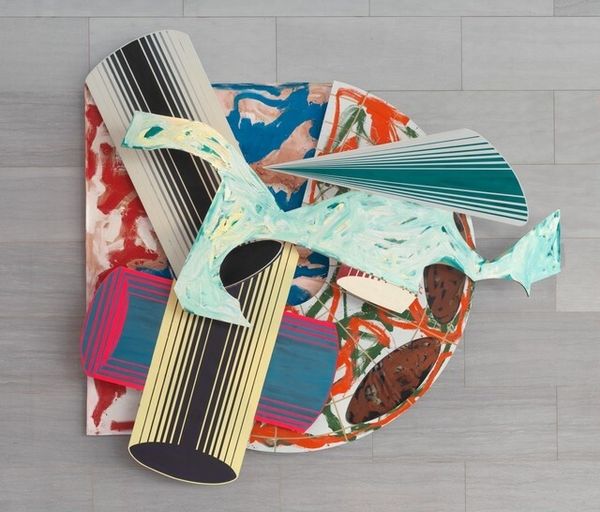 Curator: Frank Stella's "Salta nel mio Sacco" at the Tate, measuring over three meters, leaps out as a vibrant, multi-layered construction. Editor: My first impression is playful chaos. The geometric shapes and colors clash and combine in a way that feels both energetic and slightly overwhelming. Curator: Stella, working without a specific date on this piece, engages with the legacy of abstraction but pushes it into the realm of shaped canvas and collage. Think of the '70s and '80s art market embracing the spectacle. Editor: The title translates to "Jump into my Bag," which hints at a symbolic invitation. Perhaps Stella is asking us to dive into the complexities of abstract expression, where forms and colors evoke subconscious meanings. It's a bit of a Rorschach test. Curator: Or perhaps, it's a commentary on the commodification of art itself—a bag of disparate styles thrown together for consumption. Editor: I lean toward the former. The bright pink juxtaposed against the sharper geometric forms feels intentionally disruptive, forcing a re-evaluation of our visual vocabulary. Art, as a mirror of the collective unconscious. Curator: Regardless, it's impossible to deny the sheer physical presence of the work, a deliberate challenge to the traditional confines of painting, given the sociopolitical climate of the time. Editor: An invitation to explore the ever-shifting landscape of meaning, quite literally jumping into something new.