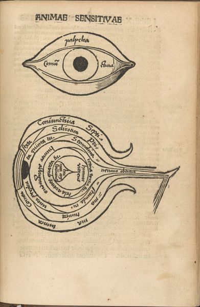 Editor: This is "Menselijk oog met een afwijking," or "Human eye with an abnormality," by Isaac Weissenbruch, dating from 1836 to 1912. It looks like an engraving or print, a very clinical-looking eye. There's an almost mechanical quality to the iris. What stands out to you about this work? Curator: The clinical nature you point out is very interesting. The eye, traditionally seen as a window to the soul, is here presented as a diagram, an object of study, almost as if divorced from the person it belongs to. Does that disconnect between the symbol and the actual representation affect your interpretation? Editor: Absolutely, it feels very detached, not like a portrait conveying emotion. More like… an anatomical study. Curator: Consider then the arrow beneath the eye. In symbolism, the arrow can represent direction, force, or even wounding. Here, positioned below a detached, almost diagrammatic eye, the arrow could suggest a directed gaze, an intent focus… or perhaps the infliction of an ocular "abnormality," as the title suggests. Does this shift your understanding? Editor: It does, that feels like the gaze is actively targeting something, and the "abnormality" could even be something inflicted, or perceived as inflicted. But why represent it in this way? Curator: It could reflect a growing scientific interest of the time, using images to classify and study anomalies. Or consider a cultural interpretation; are there ways eyes were seen in popular imagination at that time that inform it? Remember also, engravings often served to disseminate knowledge. Editor: I hadn’t thought about that, the informational purpose. It reframes my interpretation. Curator: Indeed. It seems both artistic and functional, inviting multiple interpretations. What remains with you now? Editor: That the symbolism coexists with scientific observation, a fascinating blend of art and instruction.