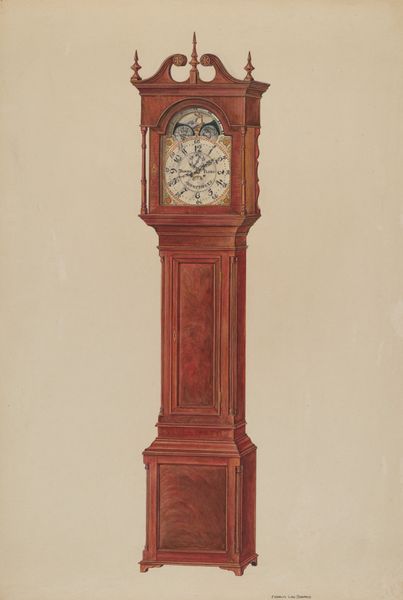 This rendering of a clock was made with watercolor on paper by an anonymous artist. It feels like the artist was trying to figure something out, working through the image to find it. The earthy browns and yellows are washed on thinly, the clock face a pale sun behind the darker wood. I love the shadow running down the center of the long box-like shape, suggesting a third dimension in this otherwise flatly rendered object. And notice how the painting sort of fades out at the bottom, unresolved. The whole image reminds me of Giorgio Morandi and his quiet, meditative still-life paintings of bottles and jars. Like Morandi, this artist seems less interested in the object itself and more interested in the process of seeing and representing it. Art isn't about fixed meanings, it's about the ongoing conversation of looking and responding.