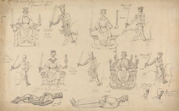 Robert Smirke's "Studies from a French MSS Bible Register" presents a captivating array of figures and objects sketched with ink and watercolor. Its structure—a seemingly random assortment of medieval figures, architecture and artifacts—invites us to analyze the artist’s method of visual note-taking. Smirke uses line and form to describe the artifacts and figures, capturing a sense of historical accuracy. The composition, while appearing disordered at first glance, reveals a deliberate arrangement. The juxtaposition of armor-clad knights, royal figures, and ecclesiastical details suggests a study in medieval symbolism and power structures. Smirke's sketch destabilizes fixed notions of historical representation by presenting a non-hierarchical collection of visual data. The artwork functions as a semiotic study. Smirke’s sketch of seemingly unrelated visual data challenges traditional artistic values and categories, and fosters a field for ongoing interpretation and re-interpretation.