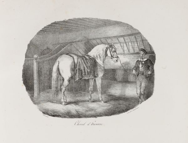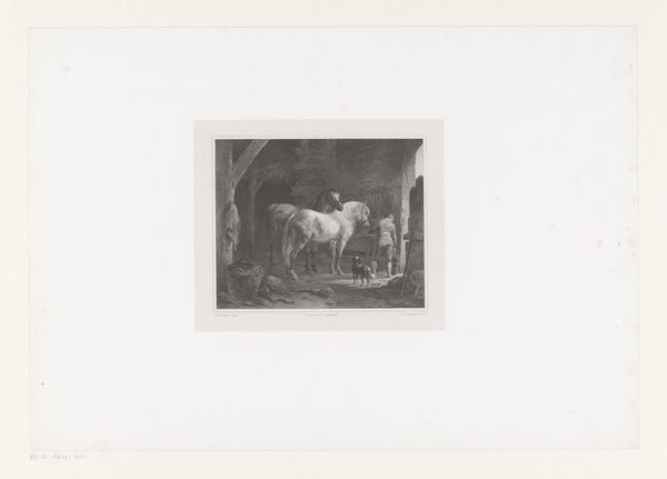 Carl Frederik Bartsch created this print titled 'En hestestald', or 'A horse stable', using etching. Its immediate visual impact is the stark contrast between light and shadow, achieved through fine, dense lines. The composition centres on two horses, their forms emerging from the darkness of the stable interior. Bartsch's technique emphasizes texture, particularly in the rough-hewn walls and the horses' coats. This attention to materiality, to the very substance of the depicted scene, resonates with a formalist reading. We can consider how the etching process itself – the incising of lines into a metal plate – mirrors the way light etches forms into our perception. The subtle gradations of tone, from the bright doorway to the deep shadows, suggest a concern with the structure of space. The lines do not merely describe the scene. They actively construct a world of tactile, visual experience. This invites us to think about how art destabilizes the boundaries between representation and material presence.