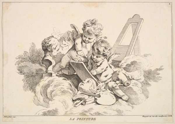 Curator: Before us we have Pierre Alexandre Aveline's print, dating roughly from 1727 to 1760, titled "Three Loves with Musical Instruments." It is held at the Metropolitan Museum of Art. What are your initial thoughts? Editor: My first impression is of incredible delicacy. The figures almost seem to float off the page, emphasized by the ethereal quality of the engraving. It makes you consider the material of the page. Curator: Absolutely. Aveline uses those delicate lines to convey more than just form. Think about the three cherubs depicted. Each engaged in musical pursuit represents different facets of love—harmony, rhythm, lyricism, perhaps. How the music brings love alive in different aspects and relationships of it. Editor: The composition intrigues me. The varying tonal qualities Aveline was able to wring from a copper plate! How long did it take to render the figures’ skin in all those tonal gradations through this kind of printmaking process? Was this artist from an academic tradition? Curator: He operated in the Rococo, a moment of theatrical display that can even make the cherubs appear to be miniature operatic singers, performing love’s symphony, the musical attributes giving depth to the theme, rooted in tradition. These iconographies can often reinforce established worldviews, but here there seems to be room for individual interpretation as to what music does to enhance love. Editor: That reference to opera made me realize it does speak to a larger world of display. Beyond the visual, could there be an aspirational element here? Who could afford such meticulously crafted prints at the time, and what statement did owning it make about them and about artistic patronage? The layers of meaning multiply! Curator: I concur. It invites a meditation on how art, love, and society intertwine. This was made possible by these means of productions and their dissemination during this time. It makes you think of the intersection between image and emotion. Editor: I will certainly consider Aveline’s work with new perspectives now. It seems we have revealed new facets of production through to cultural memory, both with considerable depth.