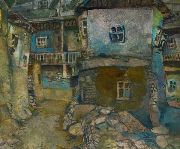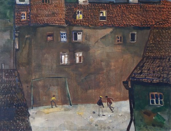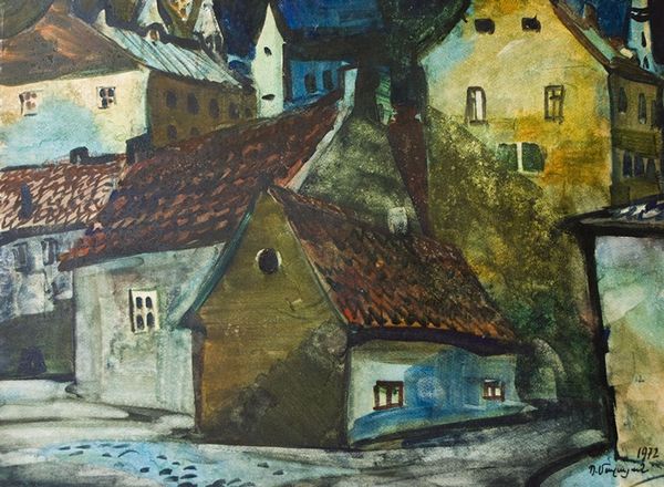 Editor: Petros Malayan's "Memories of Turin," created in 1973 with watercolor, evokes a rather melancholic feeling to me. The muted tones and densely packed buildings create an almost dreamlike, blurry urban landscape. What stands out to you, what symbols or deeper meanings do you perceive? Curator: The concentration of forms—the roofs, windows, suggesting domestic spaces—compresses the image, perhaps symbolizing memory itself: fragmented, layered, and intense. This can tell us much about the psychology of place and how cities are imprinted on our minds. It reminds us of the concept of "palimpsest," the way one set of architectural signifiers writes over another through time. What architectural clues remind you most of Turin? Editor: I'm not entirely sure; maybe the somewhat somber palette, and the steep rooftops, could speak of Turin's understated elegance... It’s almost ghostlike. Is it reaching back to history? Curator: Perhaps to an internalized, emotional history. Consider how the light filters through the buildings: do they stand robustly, or seem to dissolve in their own recollection? Memory rarely provides clean lines, after all, it's most evocative in its fragments. The windows and rooftops might represent not just physical architecture, but an architecture of the mind; layered and often partially obscured. Do you see any particular visual elements repeating themselves and potentially reinforcing a symbolic structure here? Editor: Yes, now that you point it out, the repeated triangular shape of the roofs really draw the eye and create a sense of rhythm but also perhaps confinement, as if they were crowding each other and also the viewer... Thank you for helping me decode those impressions! Curator: My pleasure. By understanding the potential symbolism behind the cityscape's form and composition, it encourages us to consider the relationship between personal and collective memory, between what endures and what fades.