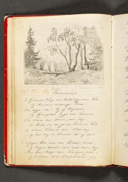 This is Johan Thomas Lundbye’s drawing, "Skovlandskab ved en kyst, med to ege i forgrunden. Hertil vers. Side 6", made with pencil on paper. Lundbye created this landscape in an era defined by Danish nationalism and the search for a distinct cultural identity. Lundbye, who tragically died young, captured the essence of the Danish landscape with a deep sense of feeling. In this intimate sketch, the serene coastal scene, framed by two oak trees, evokes a longing for the familiar. The verses accompanying the drawing on the adjacent page add another layer of meaning. "Vester glimter/Mette Stjerners Har,/Mens i Øst man skimter/Svage Morgen skjar" suggests the moments of transition and reflection found in nature but also potentially in one's life. Lundbye's personal experiences as an artist navigating a changing art world can be seen in his attention to detail and his commitment to portraying the Danish landscape as he saw it and perhaps wished it to be. The image invites us to reflect on our relationship with the natural world and its capacity to mirror our innermost feelings.