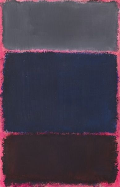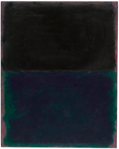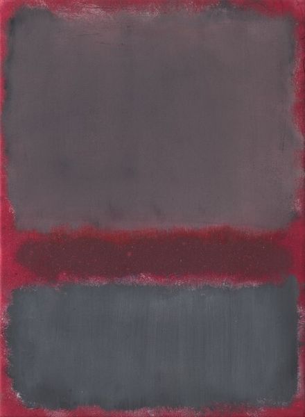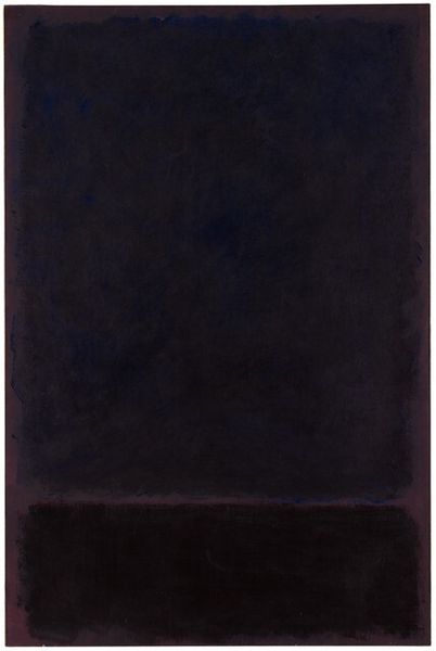 Curator: This is an untitled painting by Mark Rothko, created in 1968 using oil paint. What's your initial reaction? Editor: It’s brooding, isn't it? Dark plum hues, looming forms… there’s a weighty seriousness here. Curator: Yes, those dark purples are interesting considering the prevailing tastes of the art market, or, at least, what galleries were keen to promote at the time. You often saw Rothko in a bright mood and these are his colours, yet with all his trademark emotional tension Editor: Exactly! The forms, although simple rectangles, have this hazy, almost dissolving quality. It keeps the eye moving, searching for definition that never quite arrives. Like peering into a fog, expecting to see something emerge. Curator: Rothko’s intention, in part, was to provoke an intense emotional reaction. This painting resides within his ‘black-form’ period – and I read a very moving interpretation that the darkness signified his own looming presence and a desire to make paintings which communicated this more literally Editor: I can definitely see that. It moves away from the decorative, even though those deep shades are, undeniably, visually compelling. Did Rothko find acceptance amongst critics with his bolder works? I am just wondering how radical this particular direction would be Curator: Critical response was often divisive and some art market figures saw what he was doing and either felt jealous of his emotional authenticity, or considered him, dare I say, ‘indulgent’. The late ‘60s saw new and daring explorations, yet Rothko's pieces remained as objects that demanded some kind of attention. What could they *mean* when society and institutions were being challenged in that moment. That being said, the late '60s really were an era in themselves, where social structures were being broken down, leading figures were being targeted. It seems there was something about these pieces that made him an 'artist of his time' in some critics minds. Editor: What strikes me is how relevant a painting like this remains. We still seek meaning, still grapple with existential questions. Artworks can reflect us and provide historical signifiers, and pieces like this force us to ask what is *beyond* us. This invites conversation that perhaps was being sidelined within galleries at the time and this Rothko demands more from us than our shallow analysis. It challenges our way of seeing! Curator: Absolutely! It serves as a powerful reminder of art's capacity to stir emotions and thought beyond mere visual stimulation, making us think about where we belong now, as much as where we did then. Editor: A compelling reflection – both aesthetically and culturally.