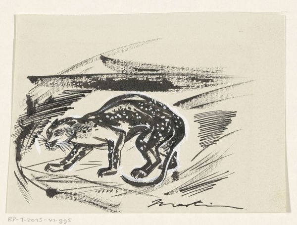 Editor: This is "Zeichnung zur Fibel_ Eidechse," a drawing made with ink on paper around 1905 by Hans Thoma. It's currently held at the Städel Museum. It has a certain raw, immediate quality. What stands out to you about the composition? Curator: Immediately apparent is the confident use of line to delineate form. Thoma’s application, though appearing casual, is deliberately constructed to convey texture and dimensionality. Note, for instance, how the density of lines around the lizard’s torso creates a sense of volume, contrasted with the sparser lines describing the ground. Do you observe any tension in the composition's structure? Editor: I think I do. The background feels almost abstract in contrast to the relatively detailed lizard. Does that contribute to the overall impact? Curator: Precisely. The juxtaposition invites contemplation on figure-ground relationship; how the subject and its environment interact structurally. Furthermore, consider the formal arrangement of the lizard's limbs and tail, each a distinct vector contributing to the dynamic equilibrium of the image. The tail, curved elegantly, counterbalances the grounded stance of the body, preventing the composition from feeling static. Is this attention to structural elements typical of Thoma's other works? Editor: I’ll have to investigate that further. Looking closely at the lines and composition has opened my eyes to how much they contribute to the drawing's liveliness. Curator: Indeed. It reveals how a seemingly simple depiction is a careful articulation of form and space, highlighting Thoma's mastery of visual language.