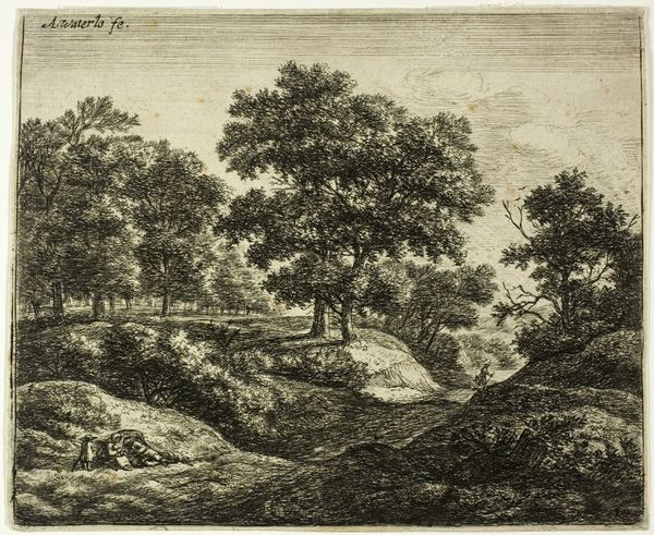 Editor: This is "Wooded Landscape with Resting Shepherd," an etching by Wenceslaus Hollar, from 1649. It feels… peaceful. Sort of how you imagine a simpler time, a calm afternoon. What strikes you when you look at it? Curator: You know, it's funny how we idealize the past. This print, to me, is a beautiful blend of observed reality and constructed artifice. Look at how Hollar uses line, almost obsessively, to create texture, to simulate depth. Is it *real*, as in how that landscape *actually* appeared? Probably not! But the *feeling* of reality? Absolutely. The detail crammed in reminds me of trying to recall my childhood home from a dream—it's all there, maybe not quite in the *right* order, or the right scale, but intensely *felt*. What do you make of the light? Editor: Hmm, it’s quite consistent, which almost feels staged now that you mention artifice. Not dramatically chiaroscuro like some of the Baroque paintings we've been studying. It seems less about creating drama, and more about showing us everything. Curator: Exactly! It’s a landscape less concerned with the sublime power of nature, more with the pleasures of simply *being* within it. Dutch Golden Age artists weren’t aiming to scare you with nature’s might; they wanted to show you its cozy corners, its everyday beauty. Notice the tiny figures. They melt into the scene; tiny witnesses not the central focus of nature. Were the sheep really as fuzzy as those little lines suggest? No, not at all! The entire scene presents an idyllic escape. The true art, I believe, lies not in pure representation, but in the crafted feeling this print creates. Editor: I see it. Thanks! I hadn't really considered how constructed these seemingly realistic landscapes could be. Curator: That crafted element gives a different dimension to something initially "natural". An artist showing that idealisation. Makes you wonder, what’s being left out.