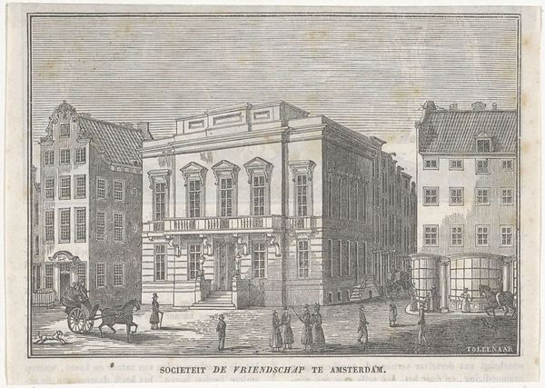 Editor: Here we have "Voorgevel van de Franse Schouwburg te Amsterdam," or "Facade of the French Theater in Amsterdam," an engraving by Noach van der Meer II, dating from between 1786 and 1790. The crisp lines and the classical symmetry create such a poised and orderly impression. What stands out to you when you look at this piece? Curator: Immediately, I'm struck by the emphasis on order and proportion. The theater is presented as a stage for civic life, reflecting Neoclassical ideals of reason and balance. It projects an image of cultural authority, but do you notice something subtly different about it? Editor: The other buildings look like residential homes! It feels almost… domestic? Curator: Precisely! That contrast reveals something of the period’s attitude towards the theater itself: it’s a social space, interwoven with daily life but elevated, set apart by its architecture and the symbolic weight it carries. Consider the clean lines and symmetrical facade. What associations do these features evoke for you? Editor: Power and authority. I think of ancient Greece and Rome! Curator: Yes. By referencing those civilizations, the artist is aligning the theater with the intellectual and cultural achievements of the past. In effect, he’s arguing for the importance of theatre as a civilizing force within Amsterdam society. The architecture becomes a symbol of enlightenment ideals. What have you noticed about the people populating the street? Editor: Now that you mention it, they are tiny, and the artist focused much more on the building itself. Curator: And why do you think so? By minimizing them the focus on the symbolism of architecture is emphasized as the carrier of collective aspirations. Editor: So it's about much more than just a building; it reflects the values of an entire era! I never thought about architecture holding so much symbolic power. Curator: Exactly! The past whispers through images like these, influencing how we see ourselves.