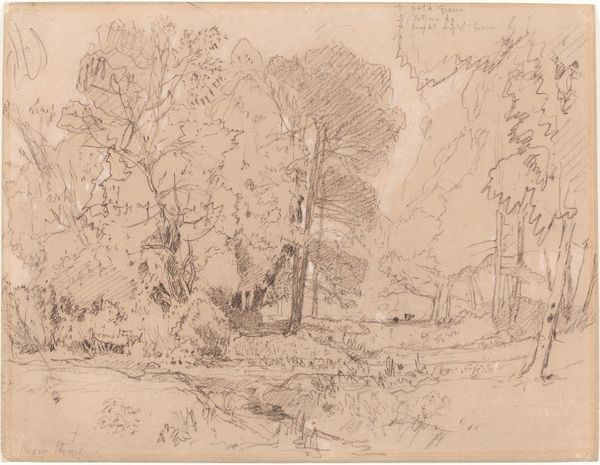 Curator: Welcome. Before us is "Bampton Grange," an undated drawing held in the collection of the Art Institute of Chicago. The medium appears to be primarily graphite and pencil on paper, perhaps with touches of ink to define certain lines. Editor: It feels ephemeral, doesn't it? Like a memory fading at the edges. The light washes across the buildings, almost obscuring them. It's strangely melancholic. Curator: Indeed. The artist uses line economically. Note the layered, almost skeletal structure—the underlying geometry first sketched out, then subtly built upon to define the architectural forms and landscape elements. There’s a sense of deliberate reduction here. Editor: I'm drawn to the textural details suggested with so few marks. The rough stone walls of the grange, for instance. One can imagine the hands that shaped them, the generations that lived within. But also the sheer labor-- how materials shaped both buildings and lives back then. Curator: A compelling point. Observe how the composition adheres to certain classical principles despite its seeming informality. The placement of the main structure creates a focal point, with the receding planes of the road and the suggestion of trees guiding the viewer’s eye through the pictorial space. Editor: And look at those rooflines, cascading one after another, a visual rhythm echoed by the stone work leading towards us. But how does that influence meaning, if at all? Were these simple tenants, a landed family...what defined that labor? Curator: We can only speculate without more contextual data. But certainly the deliberate composition—its blend of precision and suggestive incompleteness— invites us to contemplate not only the scene itself, but also the act of representation. Editor: Precisely. For me, this speaks to the essential role played by materiality. How it determined not just survival, but status too. We're all marked by the materials we come from, that make up our lives, in any case. Curator: So we both bring very separate viewpoints, but appreciate how much is conveyed through the considered execution of materials and skillful formal strategies, even in such a simple work as this. Editor: Yes, definitely more than first meets the eye. A quiet invitation to reflect, as with so much landscape art from that time.