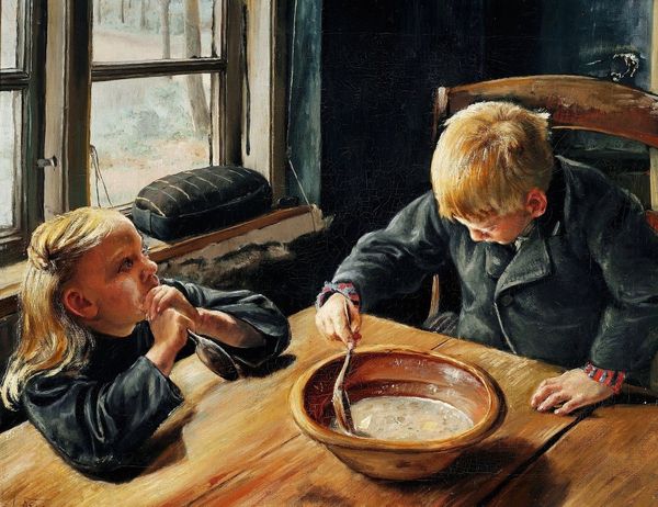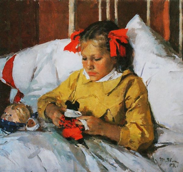 Curator: Ah, here we have a work cataloged as "Visitors," by Nikolay Bogdanov-Belsky. Note the seemingly informal style, likely oil on canvas, given the period. Editor: It’s… domestic, I suppose. My initial impression is that it’s concerned with conveying a kind of contained, perhaps enforced, quiet. Curator: The composition emphasizes this. See how the subjects, presumably children, are centrally placed, almost mirroring one another, which reinforces a certain stasis. And observe the detail devoted to the rendering of fabric, yet such abbreviation applied to the background, adding layers of visual encoding for familial settings. Editor: But what strikes me is the visible hand of the artist – the texture of the paint, particularly in their clothing, feels deliberate. It feels almost like a recording of a fleeting moment of enforced labour through clothing repair, alongside enforced deportment. Are they peasant children or is it children imitating peasantry? Curator: You raise an intriguing point about potential commentary here. Notice the textures though; the painting's painterly qualities underscore its construction as a self-contained representational system, regardless of immediate context, or labour. The repetition of form is far more resonant, almost chanting, that recalls Byzantine diptychs or portraits. Editor: I am drawn to the presentation of labour here. Everything looks hand-made. Consider also the children’s posture, quite rigid for supposed ease, the details – the inclusion of the doughnuts, sugar cubes. The artist is signalling a connection to tangible making and material culture that's palpable, a stark contrast with more luxurious aristocratic portraits of the period. Curator: Yes, I see that a cultural reading of "material context" is very present within this work, in that the depicted narrative would reflect cultural attitudes prevalent to that milieu at the time of production. To that end, one can read, in its surface qualities, an invocation of class and identity as well. Editor: It speaks to me of tradition and perhaps the constraints that come with it. What stories these carefully placed objects could tell. Curator: Yes, while this painting is undoubtedly complex on its formal qualities, the discourse allows a deep engagement with our response.