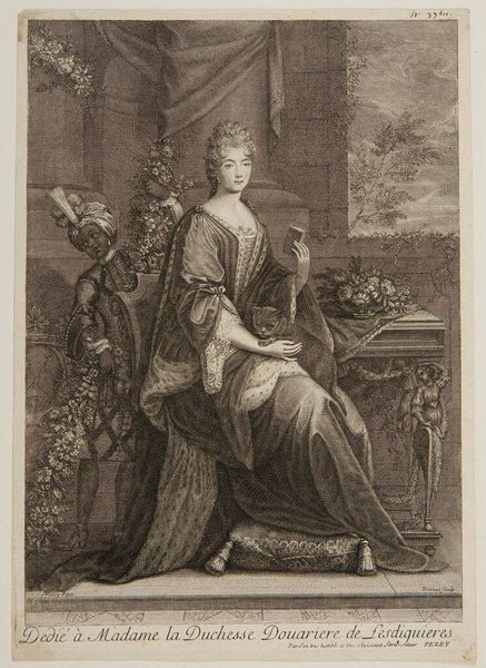 Editor: So, here we have "Muziek," or "Music," by Nicolas Bonnart, an engraving dating from somewhere between 1647 and 1718. The fine lines and the detail in the woman's dress are pretty impressive. What stands out to you in this piece? Curator: The engraving itself as a material object speaks volumes. Think about the copper plate, the labor involved in its creation, the means of its reproduction and distribution. It wasn't just about artistic expression; it was a commodity, a form of accessible visual culture for a rising bourgeoisie. Editor: Accessible? But wouldn't this be relatively expensive compared to other forms of art at the time? Curator: That's a fair point, relatively speaking, but consider it in comparison to a commissioned painting, solely owned and displayed. Engravings allowed for broader circulation. The choice of "music" as the subject is significant, too. How were musical instruments and education in music viewed within the societal context? A violin casually discarded hints at the performance aspect and also the consumer culture surrounding the acquisition and display of instruments. Editor: That’s interesting, thinking of the violin as a status symbol. I was focused on the woman and the musical score, but the neglected instrument presents a new dimension. Curator: Precisely. And what about the act of creating the print itself? Engraving wasn't original art in the modern sense, it was reproductive labor. This engraving participated in the reproduction and circulation of ideas, values, and even class aspirations. It tells us a lot about the processes of artistic creation and dissemination during the Baroque period. Editor: I never really thought about it that way – the work and means that went into just making art accessible. Thanks! Curator: Absolutely. Examining the labor and the materials used in production is essential to fully appreciate and interpret a piece.
