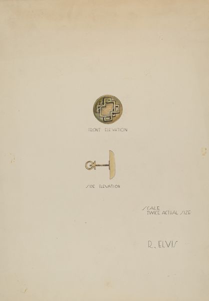 Curator: Let's examine this drawing titled "Ring," believed to have been created by John H. Tercuzzi sometime between 1935 and 1942, incorporating pencil and watercolor techniques. Editor: My first impression is one of subtle elegance. The pale blues and the surrounding arrangement evokes a sense of vintage sophistication, like something out of an Art Deco fashion plate. Curator: Absolutely, its elegance derives primarily from the concentric composition. The circular form of the ring itself echoes in the arrangement of smaller stones, directing the eye to the work’s central visual element. Editor: And I immediately want to think about the symbolism embedded within a ring, the promise of fidelity, power structures associated with owning or gifting jewelry – particularly during this historical period. Did the ring design have any larger socioeconomic implications? Curator: The rendering itself exhibits careful consideration of line and wash, note the almost mathematical precision with which the facets of the gem are suggested. Tercuzzi doesn’t just present the ring; he deconstructs its form, in a way almost like Cubism, while adhering to naturalistic representation. Editor: While that’s an interesting insight on aesthetic components, Tercuzzi created this rendering in the late 30’s during The Great Depression, which prompts the question: who exactly had access to luxurious jewelry then and whose gaze is legitimized here by glamorizing such exclusive artifacts? Curator: Interesting, yes, Tercuzzi highlights the ring from three viewpoints that together generate a dynamic image; each one a view highlighting an aspect that enriches the audience’s full sense of its objecthood. Editor: So in looking at Tercuzzi's geometric composition, considering the period and politics, how do we reconcile the object as artifact of power? Does highlighting geometric forms unintentionally obscure the power dynamics reflected by access to objects of such immense beauty? Curator: I think in analyzing this, it becomes more evident how aesthetic intentions reflect a period marked by artistic innovation amid social and economic strife. Editor: Right. Approaching "Ring" with sensitivity helps it unlock its secrets through discussions about more than what’s visible, it challenges its value in broader social constructs as well.