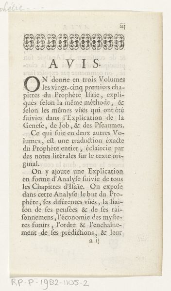 This printed announcement by Louis Cellot, a bookseller and printer in Paris, is a fascinating specimen. What strikes me is the deliberate use of typography, a powerful symbol in itself. The arrangement of text isn't merely functional; it’s a carefully constructed visual statement. The capitalized "AVIS" at the top serves not just as a heading but as a public declaration, a symbolic gateway. We see this echoed in ancient Roman inscriptions, where bold lettering on triumphal arches served to proclaim victories and assert authority. Consider how the choice of font, the spacing, and the layout collectively work to convey trustworthiness and sophistication. It's as though Cellot is not just selling books, but also selling the idea of enlightenment and cultured knowledge. This act reminds us of the enduring human impulse to imprint meaning onto every facet of our existence.