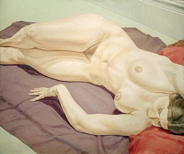 Curator: This is Lucian Freud’s “Naked Portrait,” painted in 2001, a characteristic example of his unflinching figurative work. Editor: It's brutally honest, isn’t it? The paint is so thick, almost sculptural, creating a palpable sense of the physical body and its imperfections. Curator: Indeed. Note how Freud uses impasto to build up the form, capturing the texture of the skin and the weight of the figure. It rejects idealized forms. The flesh itself becomes the landscape. Editor: Absolutely. And look at the mattress; the stained surface and those tired old ballet shoes. It is the making bare not just of a body, but of a domestic interior and all of its material and social implications. I am curious about the labor that goes into such an endeavor –the long hours spent posing, painting, and perhaps even the social class that informs this candid representation. Curator: A fruitful line of inquiry. The painting exemplifies a psychological realism achieved through formal means, the slumping pose mirrored and augmented in the visual relationships found in the formal elements and creating an emotive tonality, where we are able to empathize with her vulnerability through paint application. Editor: One wonders about the act of viewing such vulnerability. Is Freud challenging our consumption of the female form, removing the aesthetic layers to lay bare the rawness underneath? Curator: Undeniably. The artist confronts the viewer with the unvarnished reality of the human form, shying away from neither its perceived flaws nor its inherent dignity. This approach serves not to objectify but to offer a nuanced portrait of human existence. Editor: By focusing on the processes and raw materials involved, Freud compels us to confront the labour involved in constructing both art and identity, as the work acts as both artifact and embodiment of the complex circumstances that form us. Curator: I've found myself utterly absorbed by the sheer skill of formal composition and the visual relationships at play, crafting that powerful commentary you describe. Editor: The process speaks volumes here.