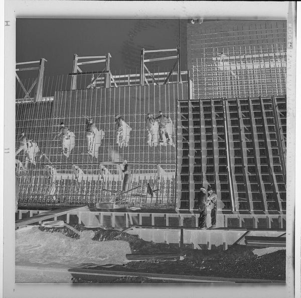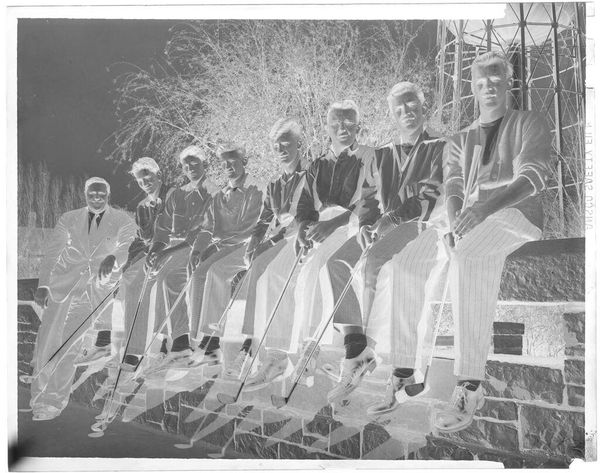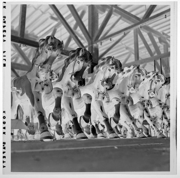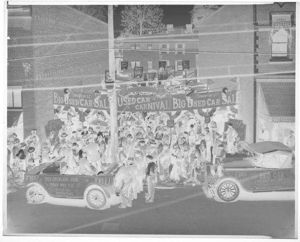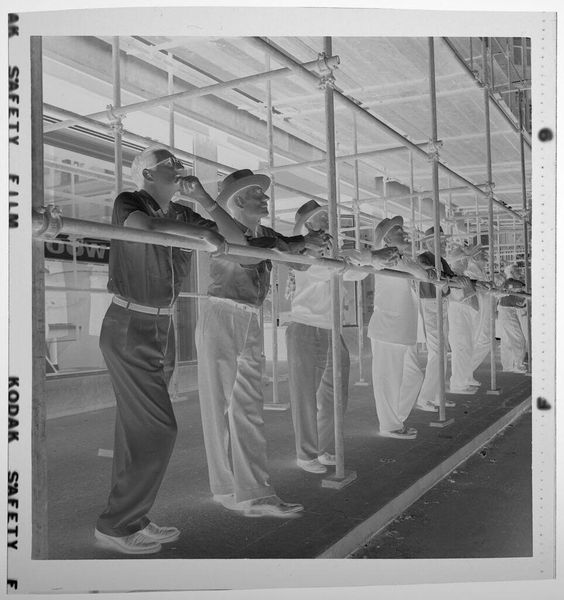 Editor: This is an untitled photograph by Jack Gould of children in costumes auditioning for a play. The image size is quite small, only 6x6 centimeters. It gives the scene a compressed and very intimate feeling. What do you see in it? Curator: What strikes me is how this image, seemingly of a simple audition, hints at larger societal structures. Note the children's costumes, and the waiting parents in the background. What roles are available to them, and who decides? The photographer's gaze, the act of image making itself, participates in that decision. Editor: That’s a perspective I hadn’t considered. It is interesting to consider how the image itself can perpetuate existing roles. Curator: Exactly. It forces us to confront the historical context of representation and power dynamics.