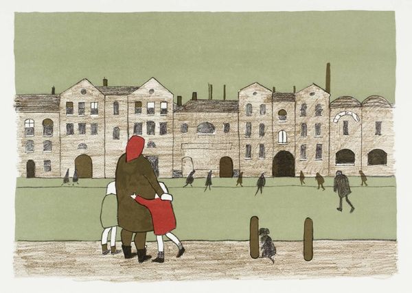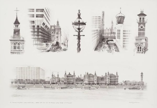 Editor: This is David Gentleman's "Seven Dials: Monmouth St, Shelton St and Mercer St," from the Tate. The way he lays out the facades of the buildings feels so documentary, almost like architectural plans. What's your take on this? Curator: Gentleman's print cleverly captures the enduring spirit of London through its architecture, wouldn't you agree? Consider how urban landscapes embody collective memory and social history, as seen here. The careful delineation of each building facade reinforces its individual presence and contributes to the overall character of the city. Editor: That's fascinating. The print seems to flatten everything, but in a way that emphasizes the unique features of each building. Curator: Precisely. It's a portrait of the city as a living archive, revealing the layered narratives embedded within the urban fabric.