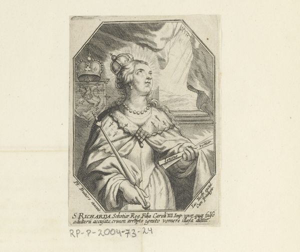 Editor: This is Marc Antonio dal Re’s "Portret van wiskundige Clelia Grillo Borromeo," an engraving from somewhere between 1707 and 1766. It depicts a woman surrounded by what look like scientific tools. The overall impression is quite formal. What do you see in this piece? Curator: Beyond its aesthetic appeal as a Baroque portrait, I see a potent statement about the intellectual capacity of women during a period that largely confined them to domestic roles. The tools aren't just props; they represent Clelia Grillo Borromeo's engagement with mathematics and the sciences. Consider the inscription—doesn't it position her within a specific intellectual milieu, a challenge to the social constraints imposed upon women's scholarship? Editor: So, the objects around her aren’t just decorative, they’re actively making a statement about her identity? Curator: Precisely! The engraving uses symbolic language to assert her position in intellectual circles, pushing against the grain of societal expectations. These images function as political acts that subtly but firmly contested the gendered norms of the 18th century. Who got to pursue intellectual endeavors and why is an age old question that still echoes through time. What are your thoughts? Editor: It makes me rethink how portraits from this period were used. I often just see them as representations of status, but this highlights how they could also represent something much more radical for the time. I’d assumed that portraits showed nobility, not mathematicians. Curator: And why couldn't she be both? Thinking critically about the way artworks represent or challenge these power structures and who gets to see or have access to this work in the past and present gives this seemingly simple portrait added dimensions that show women participating in science despite obstacles to access. Editor: It really opens my eyes to look past the surface of an artwork. I see now how portraits like this can tell us about social movements, equity and power. Curator: Indeed. It shows us that images and representation played an active role in renegotiating the boundaries of gender, knowledge, and social possibility.