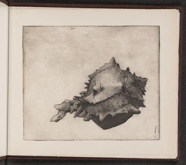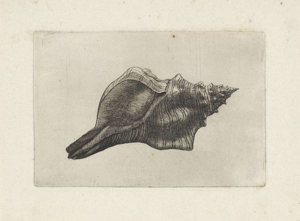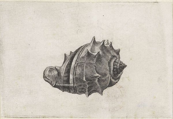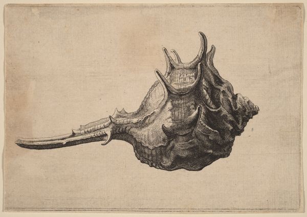 Editor: This is Wenceslaus Hollar's "Shell (Vasum ceramicum)," a print from around 1645. The level of detail in the shell's texture is striking. What do you see in this piece? Curator: Immediately, I'm drawn to the enduring fascination with natural forms. The shell, a symbol of pilgrimage and rebirth in many cultures, appears here meticulously rendered. Consider its spines—they echo crowns, fortifications, or even natural defenses. What cultural memory might these evoke for a 17th-century viewer? Editor: I hadn't thought about it that way. I was focused on how realistic it is. Were shells common subjects at the time? Curator: Precisely! Shells were increasingly popular, connected with expanding global trade, curiosity cabinets and even early scientific illustration. Hollar wasn't simply depicting a shell; he was engaging with themes of exploration, knowledge, and the wonders of the natural world, concepts intertwined with the symbolic weight of the object itself. Have you seen these in any early scientific texts? Editor: That’s fascinating. I see now that it’s more than just a pretty picture. It tells a story about its time. Curator: Indeed. Each carefully etched line whispers of cultural meanings and human curiosity, bridging art and science through a single, powerful image. These objects offer a gateway into the past! What new avenues has this opened for your perspective? Editor: Definitely more interested in how artists and the audience interact through common knowledge and symbols. Thank you!