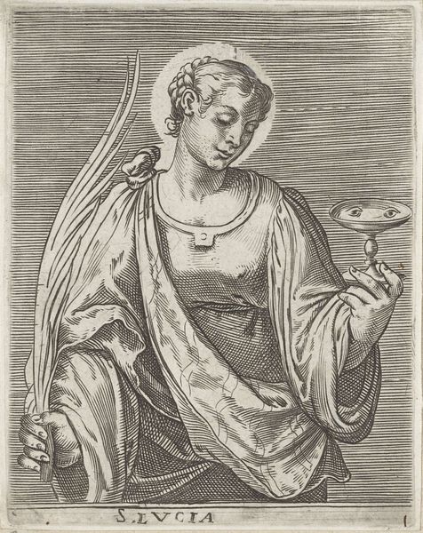 Egbert van Panderen created this engraving of the Apostle John sometime between 1610 and 1637. Van Panderen lived during a time of religious conflict and transformation in Europe. In this context, the representation of religious figures carried significant weight, reflecting and shaping societal beliefs. Here, John is portrayed with a youthful, almost androgynous beauty, typical of Renaissance and Baroque depictions. He gazes upwards, holding a chalice, evoking both purity and the mystical union with the divine. This interpretation invites us to consider the intersections of faith, beauty, and gender. The inscription at the bottom, in Latin, details John's suffering under Pontius Pilate, emphasizing themes of martyrdom and sacrifice. Ultimately, this engraving prompts a reflection on the enduring power of religious imagery to convey complex spiritual and emotional truths.