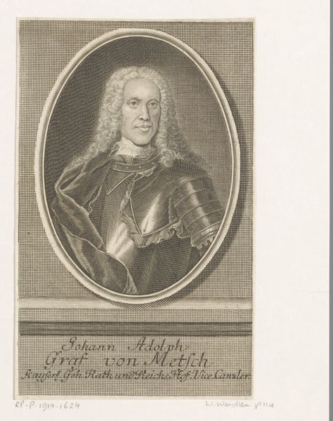 Curator: Looking at this portrait, I immediately feel a sense of formality and perhaps even a touch of melancholy. It’s as if I’ve caught this man in a quiet moment of reflection, almost unwilling to share. Editor: We’re observing "Philipp Herbert, Earl of Pembroke," rendered in tones of striking clarity through engraving techniques employed by Wenceslaus Hollar, a noted figure of the Baroque period between 1625 and 1677. The work resides now at the Metropolitan Museum of Art. Curator: "Striking clarity" is a lovely way to put it! I find myself immediately drawn to the ornate lace collar – such a detailed symbol of status. Is it meant to draw attention upward, perhaps towards his thoughtful, almost weary expression? Editor: The lace collar definitely functions as a potent visual marker. Lace, historically, has symbolized not only wealth and nobility but also delicacy and craftsmanship. Here, I see it working in tandem with the oval frame, a classical motif, emphasizing his refined position in society. Curator: The gaze certainly holds weight, doesn’t it? I sense not only intelligence but also a subtle weariness. As if bearing witness to tumultuous times. You can almost see the layers of history etched on his face! Editor: Exactly. Consider what it meant to immortalize oneself through portraiture. It wasn’t simply about capturing a likeness but also about carefully curating an image for posterity. What elements of the self would endure? Hollar, working in print, mass produces the symbol of nobility. Curator: Do you think that Hollar successfully captured that enduring element? Is it this Earl's status that transcends time, or something more personal? Editor: That’s the beautiful ambiguity of portraits, isn’t it? We read them through our own historical lens. Ultimately, "Philipp Herbert" reflects a moment of cultural performance fixed on a two-dimensional plane but charged with infinite possibilities. Curator: A potent mix indeed! It's an excellent example of how an artist captures a fleeting, ephemeral essence in something as permanent as a print. Thank you.