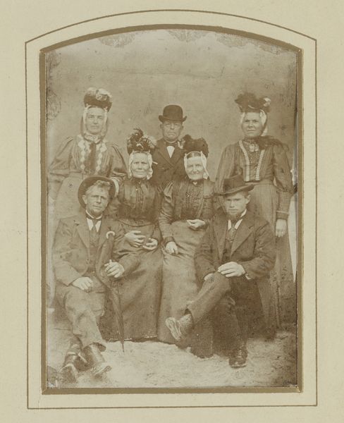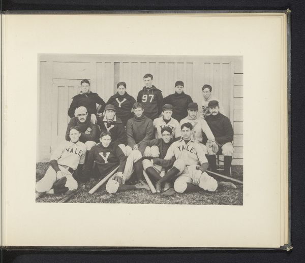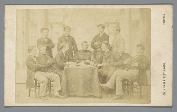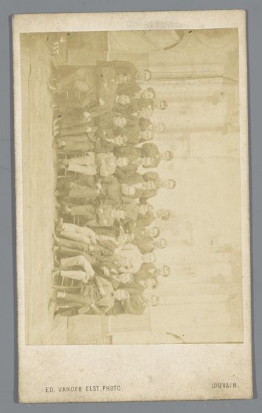 Here we see a photograph by Hills & Saunders depicting a group portrait of twenty-two men. The sepia tones evoke a sense of historical distance and formal austerity, typical of 19th-century photography. The composition is structured in a pyramidal arrangement, with the figures arranged in tiers to maximize visibility. The men's dark suits create a unified field, punctuated by the variations in posture and facial hair that offer each subject a distinct identity. Light falls unevenly across the group, casting subtle shadows that define the contours of their faces and clothing, adding depth to the two-dimensional plane. The photograph, contained within an embellished border, functions as a cultural artifact. It invites speculation about the group's social dynamics and their collective identity. The medium of photography itself, with its indexical relationship to reality, enhances the photograph’s evidentiary power, suggesting a claim to truth and historical significance. This interplay between representation and reality prompts questions about the construction of group identity and the formal conventions through which it is visualized.