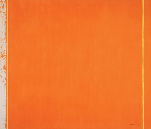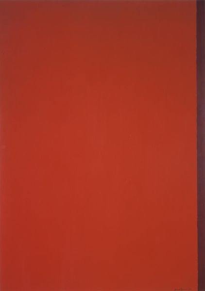 Curator: Cecil King's "Threshold - Orange", part of the Tate collection, presents a striking composition. What's your initial response? Editor: It feels like a doorway or portal, doesn't it? The stark orange is so bold and immediate. Curator: Absolutely, the orange rectangle, framed by the brown and set against the white, definitely suggests entry or transition. Color carries significance; here, orange could symbolize energy, warmth, even warning. Editor: And the very clean lines, the geometry, speaks to the social planning and utopian ideals prevalent when abstract art gained prominence in the 20th century. A sort of hopeful, ordered vision for society perhaps? Curator: Precisely. Consider how public spaces embraced such works, shaping perceptions of progress and modernity. Editor: The title "Threshold" really drives home that sense of anticipation. It invites us to ponder what lies beyond this vibrant plane. Curator: It certainly does. A visual metaphor for the unknown, rendered in a language of pure form. Editor: It's fascinating how such simple shapes can evoke such complex emotions and ideas. Curator: Indeed, it underscores the enduring power of abstract art to connect with our collective consciousness.