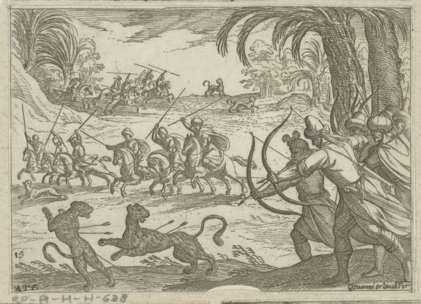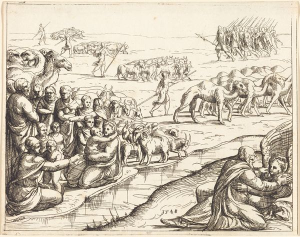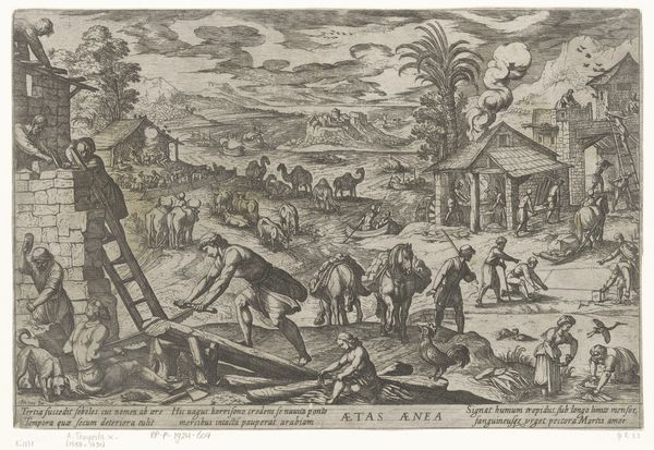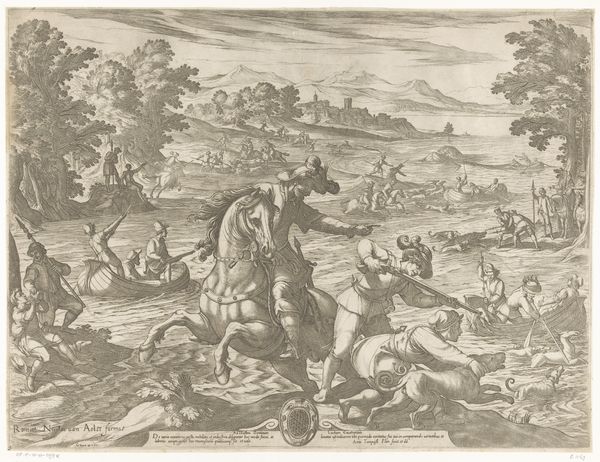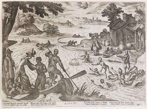 Curator: The work before us, "Augustus: vissen (maagd)" created in 1599 by Antonio Tempesta, is a remarkable example of mannerist engraving. You can currently find it here at the Rijksmuseum. What catches your eye first about this scene? Editor: Immediately, it’s this sense of… organised chaos! The landscape is bustling with figures, boats, animals. There's a dynamic, almost frantic energy, but it's all rendered in such precise detail. I find the figures wading into the water particularly compelling. Curator: It is certainly dynamic. These scenes representing the months were quite popular, weren't they? This is August, depicted within the zodiac sign of Virgo, also referred to as the Fishes here. What do you make of its symbolic layering, of earthly toil intertwined with celestial guidance? Editor: Well, you know I’m always drawn to how artworks reflect the human condition, and to see this blend of the mundane and the mythical – labourers seemingly oblivious to the winged figure watching from above - makes me think about our daily grind versus some grander, possibly unknowable plan. Or lack thereof, perhaps! Curator: Indeed. The meticulous detailing of the engraving gives each element—from the architecture in the background to the individual expressions on the figures’ faces—a particular weight, doesn’t it? Tempesta, clearly adept at history-painting, provides a very descriptive rendering. Do you think that precision adds to the overall impact? Editor: Absolutely. The crisp lines enhance the contrast. You have this vibrant scene, yet it's contained and controlled, like a carefully choreographed dance. But that control ironically makes the chaos more compelling. Look how they interact. Is the figure getting into the water for assistance, or is he there to cause further chaos? I'm instantly captivated! Curator: A final reflection? Editor: It's an exquisite depiction of controlled frenzy, beautifully rendering human experience amid larger, timeless forces. It certainly provokes that contemplative "ahhh" that I chase so desperately. Curator: Precisely! A potent demonstration of art echoing life’s complexities, then and now. Thank you.