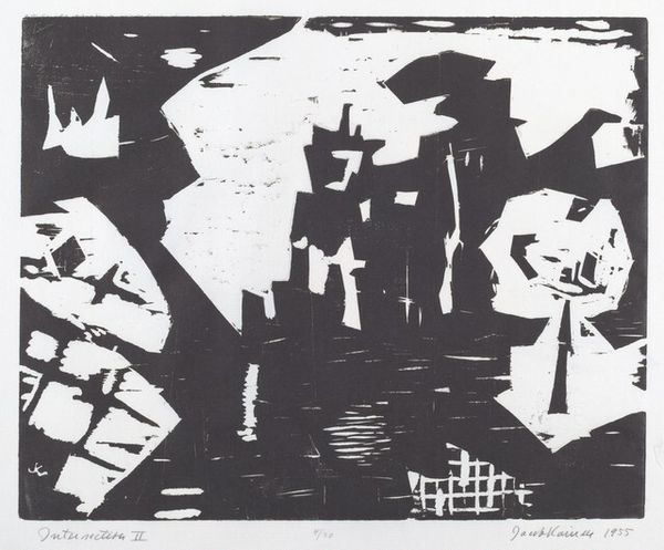 Editor: We’re looking at Lyonel Feininger’s “Benz, 2,” a woodcut print from 1919. It’s a stark black and white image of what seems like a cityscape, but fragmented and abstracted. The heavy lines create this somewhat chaotic feel. What stands out to you in this piece? Curator: Well, beyond the immediate starkness – it hits you like a dissonant chord, doesn't it? – I see Feininger wrestling with the fractured realities of his time. This is post-World War I Germany, a period ripe with disillusionment and a yearning for… something. Look at the sharp angles; they could be shards of glass, reflections of a broken world. The geometric forms aren’t just aesthetic; they are emotionally charged. What kind of emotions does this evoke in you? Editor: I get a sense of unease, maybe even anxiety, looking at it. The lines feel almost violent. I can definitely see how that would reflect the postwar mood. Curator: Exactly! And consider that German Expressionism was all about inner emotion made visible. This wasn't about painting pretty pictures, but about externalizing turmoil. This fractured cityscape – a sort of crystalline Cubism meeting Northern angst, if you will – becomes a mirror reflecting back the artist's, and perhaps a nation's, internal state. You feel it in your gut, no? Editor: Absolutely, that’s a fascinating connection. It's more than just an image; it’s a feeling materialized. I wouldn't have made that connection without you. Curator: Precisely, isn’t that the beauty of it? Art is a conversation, a whisper across time. And sometimes, those whispers can roar. Editor: That’s a fantastic way to look at it, and gives me so much to consider about artmaking after major world events. Thanks for your insights!