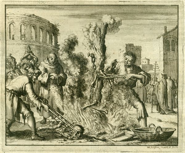 Curator: Jan Luyken created this etching, "Burning of Many Christians Called Publicans, France and England, AD 1182", in 1685. Editor: My immediate reaction is the dramatic interplay of light and shadow, typical of the Baroque. It amplifies the emotional weight of this event. Curator: Absolutely. Luyken captures the historical persecution of groups labeled "Publicans," highlighting religious and political conflict. The very term “Publicans” was a derogatory label applied to various dissenting Christian groups. Editor: The composition draws your eye to the central figure engulfed in flames, the flames creating these swirling, dynamic shapes, yet observe the lines! Precise yet filled with chaotic energy. Curator: What strikes me is Luyken's effort to document a history frequently omitted from dominant narratives. These etchings circulated as part of broader social justice movements to protest persecution, making this more than mere art. Editor: The textural variation achieved solely through line work is stunning, if horrific. Look how the crosshatched lines evoke billowing smoke versus the controlled contours defining the architecture in the background. Curator: This connects to themes of power and resistance. Who gets to control historical narratives? Whose suffering is memorialized, and whose is erased? Editor: The artist uses line and shadow so the human form becomes almost sculptural amidst such devastating brutality. We are able to observe the drama created using compositional tools. Curator: Examining it now makes me consider the continued targeting of marginalized communities globally. The details of their torture differs, yet echoes of the past remain chillingly present. Editor: Luyken clearly masters form to manipulate our emotions, compelling us to engage, aesthetically and perhaps ethically. Curator: Yes, the emotional impact forces one to contend with such injustice throughout history—such narratives remain critical. Editor: It's a powerful intersection of aesthetics and brutal human experience; the medium itself carries part of the message, literally etched into history.