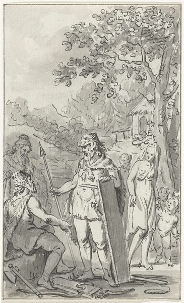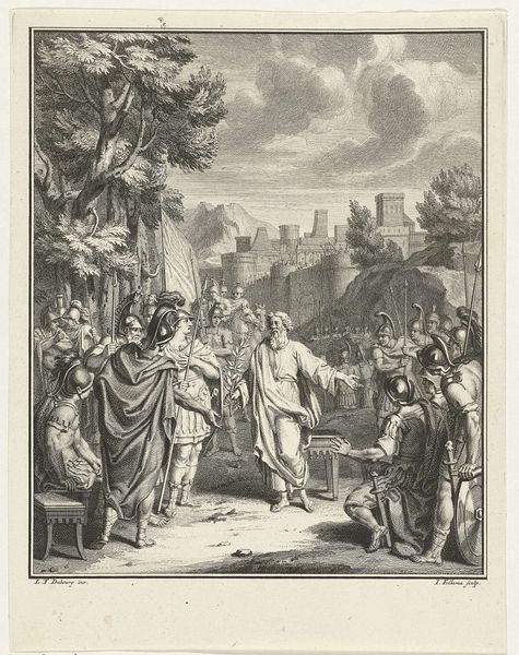 Editor: So, this engraving, "Radbod laat zich niet dopen, 719," by Johann Wilhelm Kaiser, dating from 1838-1840, depicts a pivotal moment of refusal. There's a lot of tension, and everyone is so expressive, particularly Radbod himself. How do you interpret this scene through a historical lens? Curator: Well, consider this engraving in the context of 19th-century nationalism. These historical paintings, or rather prints derived from them, were hugely popular, shaping public memory. The choice to depict this *specific* moment, Radbod's defiant rejection of baptism, is less about religious truth, and more about the assertion of Dutch identity, specifically focusing on resisting external pressures. What visual cues support that reading? Editor: I guess Radbod is portrayed as very strong and resolute in the face of the clergymen surrounding him, so perhaps Kaiser meant for the audience to empathize with Radbod’s refusal to succumb to what could be interpreted as foreign religious pressures? Curator: Exactly. Romanticism favored the emotional intensity, but it also frequently glorified national heroes and formative historical events. Kaiser strategically uses those Romantic idioms here. Think about who this print was *for* and *how* it was consumed, perhaps disseminated via newspapers and books, influencing how Dutch citizens understood their own history and cultural independence. Do you think this piece fairly represents both sides of the event? Editor: Probably not. It seems biased, celebrating resistance over religious conversion, so that feels very rooted in the social context of the time it was made rather than a straightforward illustration. I'll definitely think more about the political aims that can be hidden in these works! Curator: Precisely! Every historical artwork is also a product of its own time, influencing, and being influenced by, the surrounding societal forces. Remembering this context opens up a whole new level of meaning in visual culture.