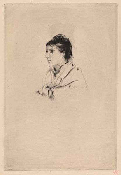 Editor: This is Carl Bloch’s 1882 etching, "Portrait of Alma Bloch." The limited tonal range gives it a quiet, introspective mood. What can you tell me about it? Curator: The somberness you noted is quite perceptive. Realism, even in portraiture, reflected the broader socio-political climate. The image depicts a woman who is bound by the patriarchy prevalent in 19th-century Europe. Do you see how her pose conveys reserve, a containment of self? Editor: I do see that. The etching feels unfinished around the edges; almost like a fragment. Was this typical for portraits at the time? Curator: That fragmentation speaks volumes! It subtly disrupts the traditional patriarchal narrative of completeness and ownership associated with portraiture, particularly of women. Bloch’s choice not to fully define Alma within the picture plane raises interesting questions. Does it give her agency? Editor: Agency in what sense? Curator: By presenting her as incomplete, almost resisting full capture, does Bloch allow for a reading that goes beyond mere representation of wifely submission? How does it contrast to more typical portraits of women at the time? Editor: It's interesting you say that, because in contrast with typical representations, Alma does seem to retain an air of mystery. Thanks, I learned a lot by reconsidering it through the lenses of social commentary. Curator: Precisely. Thinking about those intersections of artistic intention, social constraints, and individual expression opens so many avenues.