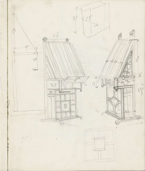 Curator: Welcome. We’re standing before Carel Adolph Lion Cachet's "Interior with Paneling, a Sofa, and Fireplace," a pencil drawing created around 1903-1904. Editor: Immediately, the lack of precision strikes me. It’s almost like looking at architectural aspirations caught mid-thought, or even some private intimate desire visualized within one's four walls. Curator: Cachet was working during a period of rapid industrialization and urbanization, when the design and decoration of domestic interiors became increasingly important as a means of expressing personal identity and social status. Modernism in full bloom! This drawing showcases architectural and decorative elements prevalent at the time. Editor: And the way the lines scratch at the paper...there's a definite Modernist rejection of classical beauty standards here. The interior shown lacks the soft touch one would assume of a well lived in place: it seems almost like an emotionless design proposal. It has no identity of its own. Do you think it reflects anxiety about the changing roles and relationships produced by Modernity? Curator: Very possibly! It’s crucial to remember that the decorative arts—the creation of spaces people inhabit—have long been associated with gender, especially femininity and domesticity. Cachet seems engaged with similar conversations and actively tries to explore an idea of place outside of old definitions. I can not ignore the social context from which these walls emerge, the art is meant to create belonging and instead gives off emptiness. Editor: Precisely, and let’s not forget about the social and economic disparities reflected, or rather hidden, within such spaces. This drawing captures a very specific type of interior, a privilege unavailable to many, then as now. The stark lines feel not just aesthetic but indicative of those divides. Even the architectural and geometric are political here! Curator: The museum context adds another layer. Exhibiting this drawing invites viewers to contemplate the values and aspirations of the period, the changing meanings of home and privacy, and the role that design plays in shaping our identities and social relations. Editor: I wonder how many visitors, particularly those from marginalized communities, feel represented or alienated by these interiors...or perhaps even activated! I certainly hope this artwork starts important conversations! Curator: It certainly is a great conversation starter. Seeing art with an eye for its history reminds me how crucial these conversations really are. Editor: I’ll say! It brings to question everything, but perhaps it helps rewrite definitions and meanings, and in so doing reconfigure belonging in this very museum!