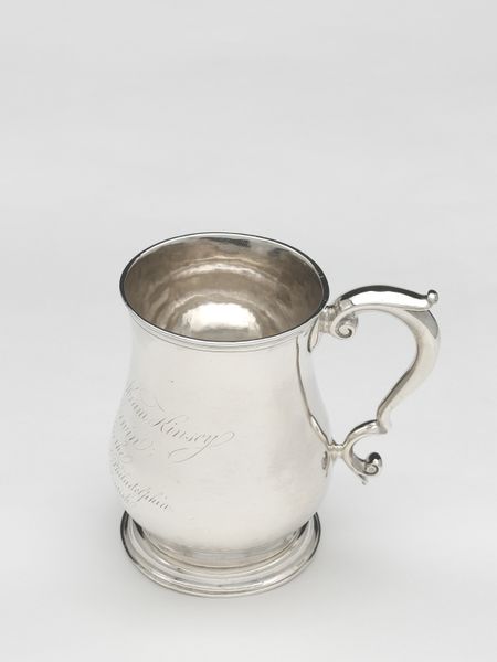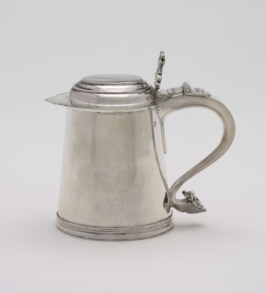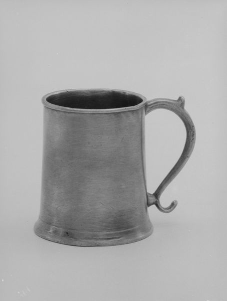 This Tankard, made by Thomas Danforth Boardman, presents a study in functional form, its creation driven by utility yet resonant with visual interest. The pewter surface, aged and subtly reflective, invites contemplation. Notice the cylindrical body, grounded by a flared base, asserting stability. This groundedness contrasts the upward sweep of the handle, which terminates in a delicate curl, introducing a touch of whimsy to an otherwise utilitarian design. The parallel incised lines around the body subtly segment the surface, disrupting the monotony of the cylinder and inviting a play of light and shadow. The Tankard engages with ideas of structure and semiotics through its construction, each element—base, body, handle—serving both a functional and symbolic role. The circular mouth and handle, both voids, play with concepts of containment and accessibility, hinting at broader themes of consumption and social ritual. This object is a testament to the power of simple forms to communicate complex ideas about culture, utility, and human interaction.