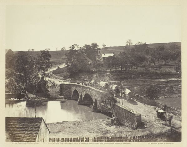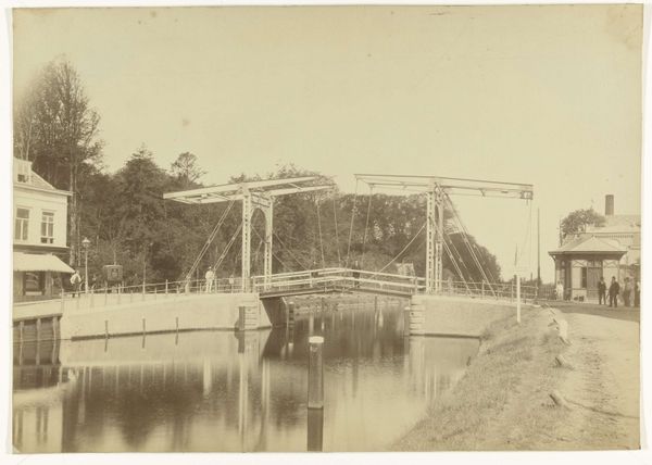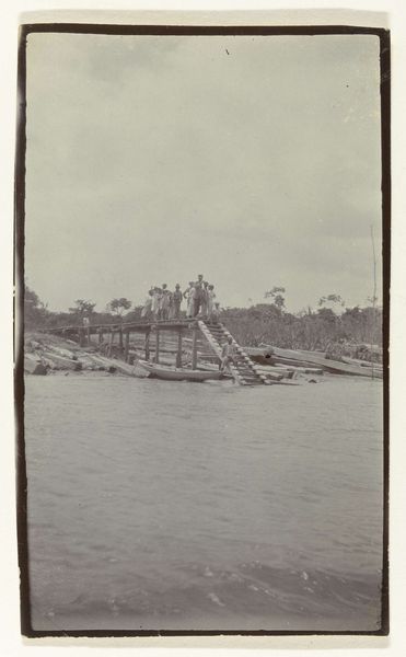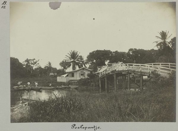 Curator: This is a photograph entitled "Paul Sandel op boot PS 7 voor de Sandelbrug in de Wampoe rivier, Tandjong Poera, Langkat Sumatra," created circa 1890 to 1900. It's an albumen print by Heinrich Ernst & Co, part of the Rijksmuseum's collection. Editor: The initial impression is serene. The tonal range of this albumen print offers a gentle depth that makes this Sumatran river scene so engaging. The water looks still, reflecting the structures in its path. Curator: Indeed. It showcases a detailed depiction of river transport and the colonial infrastructure present in Sumatra at the turn of the century. Note the boats and the bridge: clearly structures designed to enable the extraction of resources. Editor: I am captivated by the bridge's design, so airy and structured! The white contrast of the supports with the darkness of the jungle is almost rhythmic. How does the composition influence our understanding of the space and these human forms inhabiting it? Curator: The inclusion of the men on the boat draws our attention to the process of labour, connecting the scene directly to colonial enterprise, the harvesting of raw materials. What were the material conditions? How was the economy functioning? Those questions haunt this photograph. Editor: Certainly, that’s crucial to interpretation. Looking closely, I’m interested in the details revealed by the print: The reflections are wonderfully captured by the camera and by the albumen. And also how the photographer frames nature here--a view from an imposed, yet constructed reality. Curator: This kind of photography offered Europeans a curated view of their colonies, didn't it? It promoted trade but obscured labor. Editor: Perhaps. But its formal attributes give texture to that endeavor. Look at the organization of visual elements to form the picture, an exercise in symmetry and composition in service to… what? Certainly more than commerce. Curator: It shows us more of the how of colonial operation: in documenting the exploitation through landscape. A photograph is just a moment caught in time but a lot of conditions are reflected in this landscape. Editor: True. Its power lies, maybe, in precisely that balance: this landscape captures something immutable of colonial life.