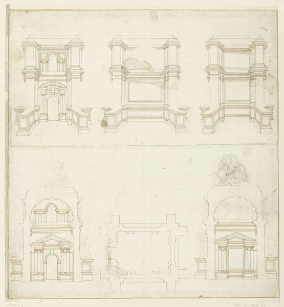 Curator: Here we have a design drawing rendered in ink on paper by Giacomo Leoni. Its full title is "Design for a Square Portico, Crosswise Intersected, with Statues on the Balustrade and in Niches," and it likely dates from between 1655 and 1740. Editor: My immediate impression is one of controlled fantasy, a beautiful contradiction. It's precise, almost clinical in its linework, yet it depicts a space ripe for theatrical happenings. Curator: That's an insightful reading. Leoni was instrumental in bringing Palladianism, a classical style characterized by symmetry and order, to England. Drawings like this showcase the core principles that would redefine British architecture for decades. The crosswise layout suggests not just a building but an entire planned environment, an intersection of social spaces. Editor: Absolutely. There's a latent grandeur that’s incredibly seductive. I love the implied narrative with those statues posed high on the portico and nestled in niches. They beckon; it feels like the prelude to some forgotten ritual or noble assignation. It reminds me a little of Piranesi’s more whimsical fantasies. Curator: Yet Leoni never reached the overtly theatrical Piranesi stage. His use of classical realism anchors this design. While evocative, it ultimately speaks to structure, rational organization, and the enduring appeal of classical ideals during a turbulent era. It’s worth noting that this blueprint transcends function. It communicates status and projects the image of a cultivated patron. Editor: I see that completely, but I can't shake this sense of controlled dream space. Imagine stepping through those archways... each view so carefully curated and shaped. You feel almost as though it is possible for anyone, entering that designed space, to play the heroic characters posed so decoratively in the frame of the blueprint. It gives you ideas! Curator: Indeed. Thinking about the societal function behind this image as a blueprint, this square portico represents something monumental – an idea of permanence through design. Editor: To me, it is less a symbol of endurance and more like stepping into someone else's elegant fantasy. I mean, think of how architecture might change the way a person conceives their reality – what a legacy to leave.