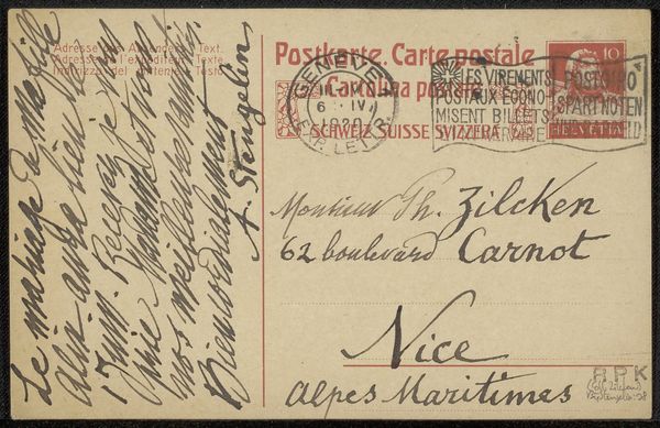 Curator: We are looking at a vintage postcard addressed to Monsieur Ph. Zilcken in Nice, France. Its maker is Alphonse Stengelin and is presumed to predate 1925. Made using both print and photography techniques, the artifact shows both a printed text and design alongside hand-written messages. Editor: My first impression is intimate; it seems almost like a private whisper across time. It’s incredibly direct because it is immediate--a quick delivery to the recipient. I can practically smell the old paper and ink. What grabs you about it? Curator: Beyond the directness, I'm fascinated by its material composition. Consider the labor involved: from the photographer, printers of the card template in multiple languages, postal service to Stengelin's handwriting – a layered, accessible form of communication reliant on industrial production and deeply personal engagement. Editor: I’m wondering, though, about the conditions surrounding its creation and the act of its being sent. Who was Stengelin, what was their relationship with Zilcken? This postcard encapsulates an entire intersectional story. I also can't ignore the implicit class element-- who has the luxury and access to send such correspondence. Curator: That’s a crucial point. Yet, I see how the industrial aspect democratizes communication; something so widely accessible provided it fit within the means of a modern worker. Consider that this small act of postage might represent global shifts and individual empowerment to reach across geopolitical boundaries, using available technologies. Editor: Still, within the reach that technology can give, we need to recognize the constraints of those spaces and power dynamics, too. For example, if this person sending the letter is living within colonialism, how do these personal spaces serve colonial networks and what implications arise from this. Curator: Absolutely; this seemingly innocuous postcard reveals a web of complex material and historical forces. Editor: Exactly. Examining this small piece reminds us to analyze who has historically been written *out* of these visual landscapes and histories. Curator: Agreed. Thank you; on closer examination, a wealth of untold stories and unwritten power systems emerge, indeed, across every inch and angle here. Editor: Indeed. Every object carries multiple intersecting contexts, inviting critical reflection on who made it, who was it for, what world they lived in and how it reverberates with us.
