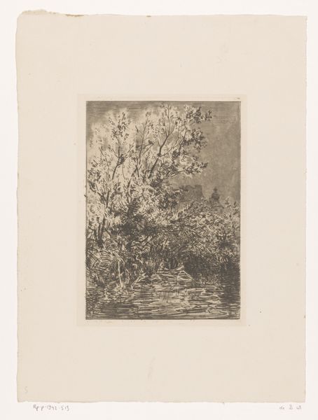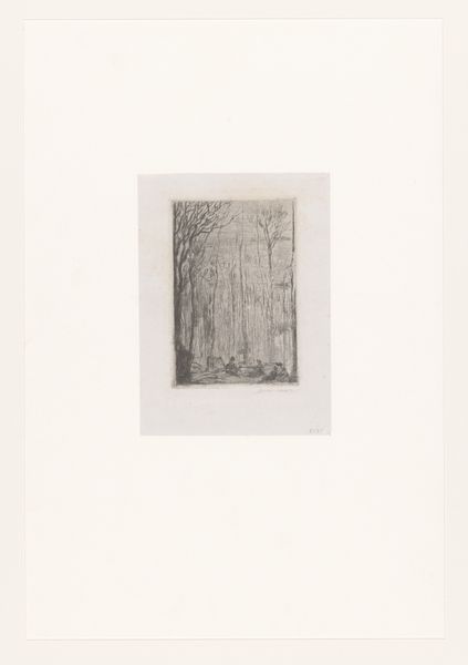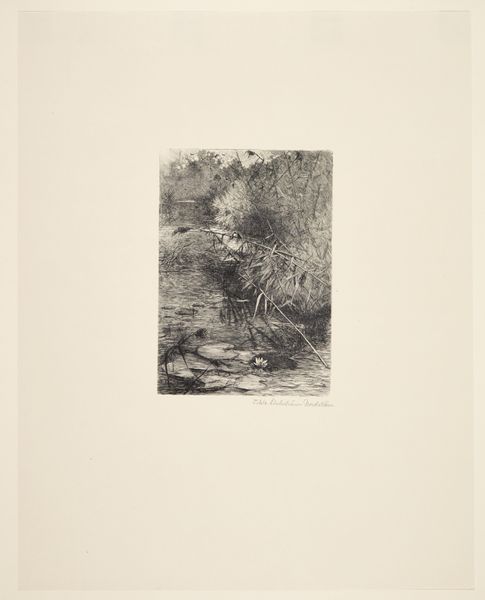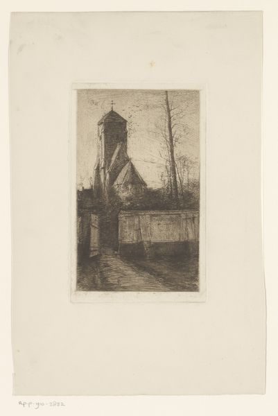 Curator: There's a real sense of quiet about this piece. It reminds me of a stage set, somehow, stark against all that white paper. Editor: This is August Jerndorff's "Aftenlandskab ved en smedie" from the 1890s. It's an etching on paper, held here at the SMK, Statens Museum for Kunst. The title translates to "Evening Landscape by a Smithy." Curator: Smithy… It’s curious how that almost medieval image of a forge lingers, even as the Impressionistic style gives it a decidedly modern twist. What kind of memory are we engaging here? Is it a cultural nostalgia? Editor: I think that’s perceptive. Etchings were becoming increasingly popular as they allowed artists to produce images quickly and relatively inexpensively, disseminating them widely, shaping perceptions of what constitutes 'Danishness' and idyll in this period. Consider that most people in Copenhagen at that time might never have been to such a place but they likely imagined they knew what one looked like. Curator: The light in this scene feels more psychological than real. It casts an eerie glow, making me question if the cottage is actually welcoming or perhaps harboring secrets, an inviting stage, yet shadowed. What's at play with light in relation to social representation here? Editor: Light certainly takes center stage. Its rendering through etching techniques brings about a blurring effect which emphasizes an idealized impression over sharply defined realities, aligning the imagery of a simpler rural past with a more complex industrializing present. Curator: It speaks to the potency of negative space, the quiet corners of our shared past we perhaps invent and then reinhabit time and again. Editor: Precisely. Jerndorff’s strategic deployment of it allows for these images to act almost as mirrors. We glimpse not only landscape and the structure it holds but the projected societal anxieties and aspirations of their audiences as well. Curator: This small etching expands a wide panorama for thoughtful contemplation! Editor: Indeed, a beautiful example of how printmaking captured, reflected, and reshaped Danish identity during rapid social change.
