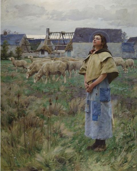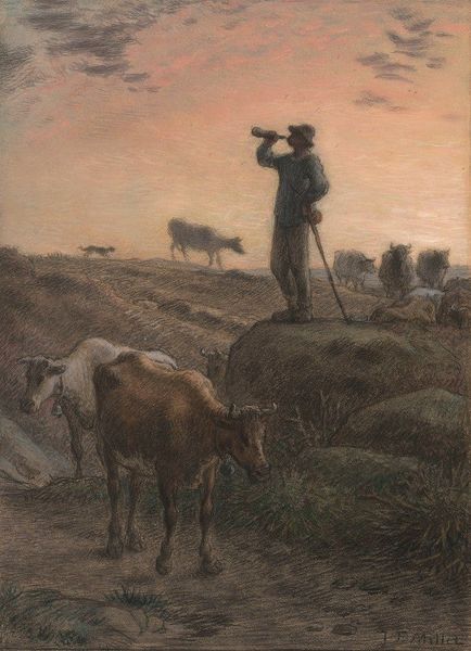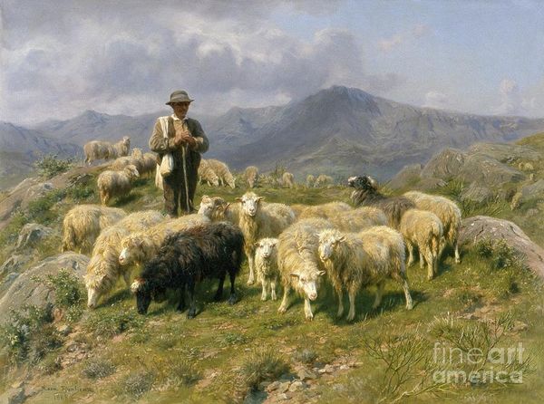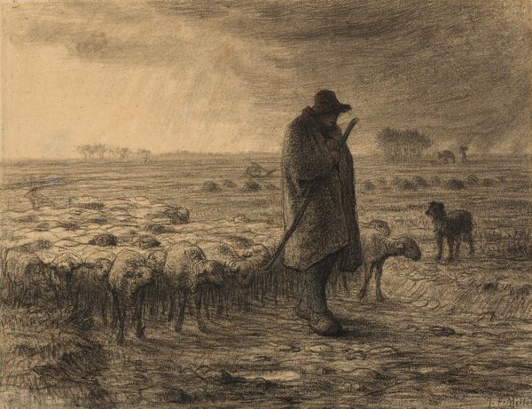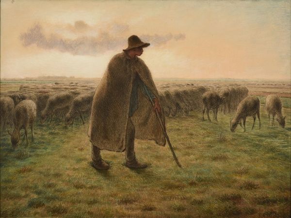 Jean-François Millet composed this painting, ‘Shepherd Tending His Flock’, with oil on canvas. The subdued palette and broad brushstrokes evoke a sense of rural solemnity. The shepherd, enveloped in a heavy cloak, stands guard over his flock, merging with the landscape in a display of painterly unity. Millet employs a careful arrangement of forms, anchoring the composition with the shepherd's figure, while the sheep are distributed in loose groupings across the plane. This ordered placement directs the viewer's eye through the scene, inviting contemplation on themes of labor and nature. The earthy tones and textured surfaces speak to a material honesty, reflecting the realities of rural life. The painting functions as a semiotic system, where the cloak becomes a signifier of protection. Millet’s formal choices here challenge traditional genre painting, suggesting a deeper engagement with the subject beyond mere picturesque representation. The painting's structure thus serves not only an aesthetic purpose but also carries cultural and philosophical weight.