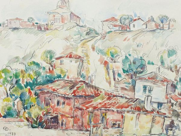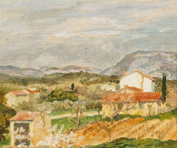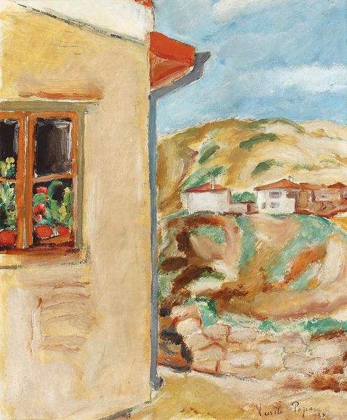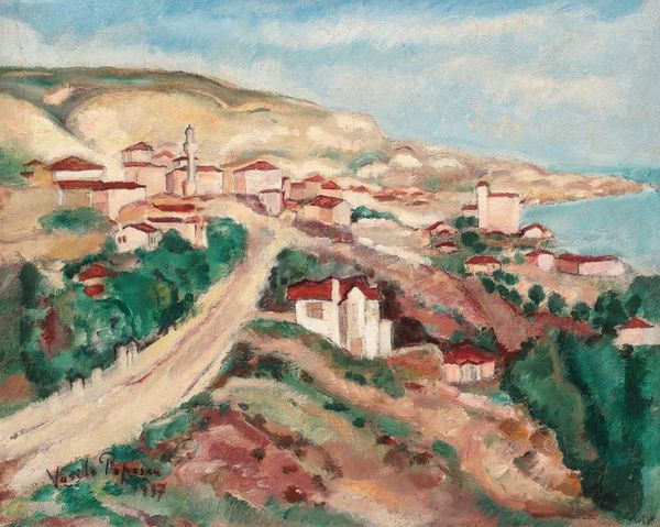 Editor: So, this is “Balchik Hills” by Micaela Eleutheriade. It’s an oil painting, and has been identified as impressionistic. There's something about the composition, how the buildings are stacked, that gives it a slightly surreal quality, almost like a dream. What's your interpretation? Curator: The rhythmic stacking of these buildings resonates deeply. Look how the artist has employed a simplified palette, bathed in golden light. What emotions are stirred in you when observing the sole figure present? Does she evoke a sense of loneliness, resilience, or perhaps, belonging within this stratified community? Editor: I think maybe a bit of loneliness? Or perhaps just…contemplation. There's not much detail, so she's really more of a symbolic presence than an individual. But the colours are so warm! Curator: Indeed. This simplification isn’t merely stylistic. The visual choices carry cultural weight. In traditional iconography, colours possess symbolic values – gold representing divinity, warmth, and spiritual enlightenment. In a similar vein, even the stacking could allude to a social hierarchy. But let's circle back to the woman. What if she embodies not solitude but a silent connection to place, a witness to generations, walking through the painted memories? Editor: Oh, I like that idea a lot more! She's like… a memory herself. Curator: Precisely! And memories can become symbols. Notice too, how Eleutheriade’s impasto technique and plein-air approach bring a sense of immediacy. It invites you, viewer, to partake and complete the experience within your own lived history and perception. It is our act of reception that fully actualizes the art. Editor: I never thought about landscape painting having so much embedded symbolism! I'll definitely look at impressionism differently now. Curator: It’s all about peeling back the layers and realizing the past persists, woven into the very fabric of our present-day vision. I find such continuity, that cultural echo, truly profound.