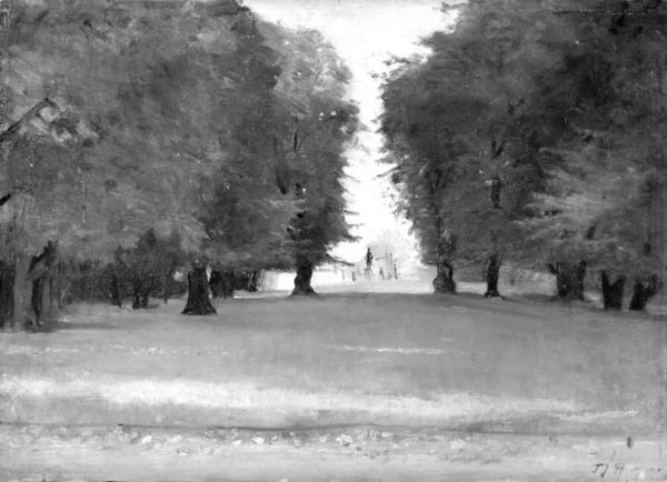 Curator: This is an Untitled photograph by Martin Schweig, housed here at the Harvard Art Museums. It captures the back view of what appears to be an outdoor wedding. Editor: My first impression is one of stark contrast. The strong linear perspective draws the eye down a dark aisle, flanked by lighter figures and trees, creating a sense of depth but also almost a barrier to the figures at the far end. Curator: Indeed, the formality of the wedding contrasts with the natural setting, perhaps reflecting a desire to publicly legitimize a union within a somewhat untamed context. Editor: The inverted tones add a layer of abstraction. It is almost dreamlike. The texture seems rough, emphasizing the materiality of the photograph itself. Curator: The photo offers an interesting insight into a social ritual, where nature is both a backdrop and a stage for personal milestones. Editor: A compelling piece, where formal elements like contrast and perspective serve to amplify the sense of a life-changing moment.
