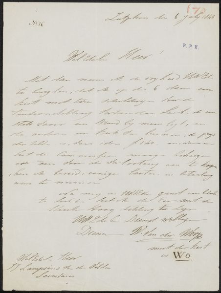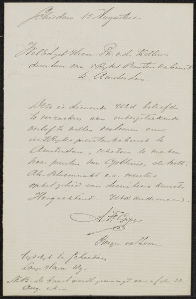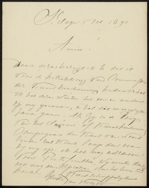 This is a letter by August Allebé, written in Amsterdam on October 6, 1895. The letter is addressed to Hendrik Willem Mesdag and Sientje Mesdag-Van Houten. As a director of the Rijksakademie van Beeldende Kunsten, Allebé played an important role in shaping the next generation of Dutch artists. This letter offers a glimpse into the social networks that supported artistic production. Written during the height of the Dutch Golden Age, this letter reflects the importance of patronage and personal connections in the art world. The references within the letter demonstrate the social etiquette of artistic correspondence. Allebé expresses his gratitude for a letter he received from the Mesdags, acknowledging their support and generosity. He closes the letter with a sense of high regard. Understanding the historical context of this letter requires further research into the Rijksakademie, the artistic scene in Amsterdam, and the relationship between Allebé and the Mesdags. By examining these social and institutional factors, we can better understand the role of art in Dutch society at the time.