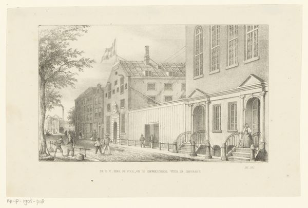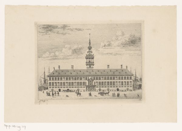 Curator: Allow me to introduce Cornelis Pronk's "The Binnenhof in The Hague," a cityscape created after 1741. It is meticulously rendered with ink, graphite, and pencil. Editor: There’s something so orderly, almost mathematical about it. I feel like I'm gazing at a stage set, waiting for the players to enter and bring it to life. It seems very proper. Curator: Indeed. The structural elements dictate the work's conceptual integrity. Pronk uses line and perspective to organize the composition around the implied orthogonal axes, emphasizing the architecture. Notice how the Binnenhof’s repetitive arcades form a rhythm. Editor: The artist carefully invites our gaze through these elegant arches; and with a muted palette. It is rendered with such finesse that you almost feel as though you’re walking on to the cobbled square. But I also note that most figures have no faces! Curator: Faces are less important than their role within the scene. The faceless figures function as markers of scale and human presence, becoming integrated structural components that accentuate the depth and vastness. It amplifies the monumentality. Editor: In a sense it depersonalizes those figures. Perhaps it represents them less as individuals and more as components of civic society, extensions of that looming edifice. It makes me ponder how deeply the architecture affects individuals and shapes human existence. Curator: Such analysis resonates with structuralist theories, in which individuals serve prescribed functions according to established systems and norms. Here Pronk illustrates the prevailing structures and visual conventions shaping perception in 18th-century Dutch society. Editor: Ah, a lens through which to appreciate that relationship; though for me it will also be those airy trees flanking one side! Curator: Trees do play an interesting game of contrasting nature versus building. Thank you for bringing your insight. Editor: It has been enlightening to observe architecture become an intricate play on social reflection through a formalist gaze.