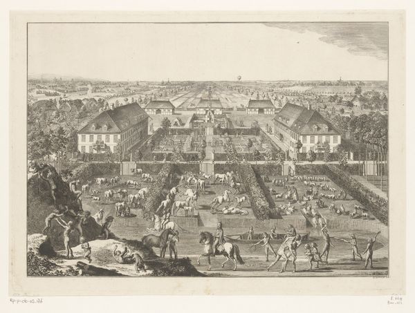 Curator: Here we have "Rand van de Grote Hagen (linkerblad onderkant)," a print created around 1675. The artist, Christiaan Hagen, rendered this cityscape using etching and engraving techniques. It's currently held in the Rijksmuseum collection. Editor: My goodness, look at the sheer density! It feels like looking at a teeming ecosystem more than a town. All those tiny trees jammed together – it's almost claustrophobic. Like being surrounded by well-behaved but persistent shrubs. Curator: Well, that tightly packed nature reflects both the landscape conventions of the Dutch Golden Age and perhaps the perceived order of the time. The walled city itself is a symbol of safety, control, civilization… notice the way the lines draw your eye directly to the church. Editor: Yes, everything seems meticulously planned. Not a wild weed out of place! And that church looms, doesn't it? Almost feels like it’s breathing down the city’s neck, judging the place. Maybe I’m just projecting. I tend to see judgment everywhere these days! Curator: Perhaps not. Churches in art, especially during this era, do represent not only faith but also temporal power, moral authority, societal structure… the unshakeable presence. Think about how visual language reinforces established ideologies. The placement isn't accidental. Editor: That’s fascinating! All those symbols buried under neat little lines… I just saw a wall and a lot of greenery! So, if the wall means safety, what does it keep in… and what does it keep out? Maybe those trees aren’t just a stylistic choice… maybe they're part of the whole symbolic package. Curator: Exactly. Consider the historical context: The Dutch Republic, recently independent, defined itself by its civic order. The walls and gardens denote boundaries, security, prosperity… They project a cultivated image, both literally and figuratively. Editor: It's amazing how much meaning they could pack into what, at first glance, looks like a really detailed city plan. It reminds me that everything, even the things that seem most objective, has a slant, a point of view. Curator: Indeed. Hagen gives us more than just topography; he offers a glimpse into the values and self-image of a society. Editor: Well, now I see it differently! It’s a lot more unsettling, which somehow makes it even more interesting! I need to go stare at some weeds now. Curator: A fine way to reconsider our preconceived notions of what constitutes meaningful order.