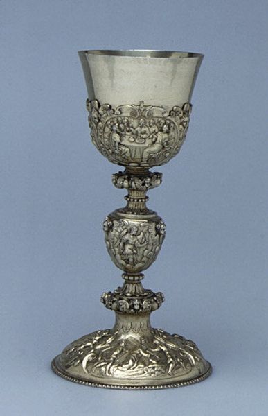 Curator: The baroque extravagance is evident at first glance. The Cup with Cover, crafted between 1600 and 1605 by Hans I Warnberger, is currently held at the Metropolitan Museum of Art. It exemplifies a mastery in silver and gilding. Editor: Its silvery sheen is breathtaking. There's a strong vertical thrust that emphasizes the ceremonial function, no? It certainly seems designed to impress more than for everyday use. Curator: Absolutely, objects like these reflected not only wealth but also social and political standing. Cups were highly significant in formal events during this era, often carrying deep symbolic importance. You see how figures are sculpted around the object, especially on the cup section itself. Editor: The human-figure and history-painting are so dominant—is it meant to evoke historical events? And what about the finial atop? Who does he symbolize, I wonder. It reminds me that baroque objects weren't just aesthetically pleasing; they served specific purposes within complex social and political landscapes. The symbolic program of an object speaks volumes, of course. Curator: I am captivated by the swirling movement; the cup narrates history. Its very shape directs upward like some elaborate moral lesson. What does history and the ruling classes stand for if not something for humans to look up to, even imbibe from? Editor: Yes, I see how that ascent mimics societal ambition! In that era of exploration and discovery, it projects power both religiously and worldly! To me it shows, perhaps not a divine path but the sheer ambition of men mirrored by baroque style as social statement of power made permanent. The object itself becomes evidence in a much larger discussion on socio-economic transformation. Curator: I agree with your perspective entirely, that baroque object contains entire social structures within it and speaks on behalf of their beliefs. This conversation illuminated how objects embody aspirations of power, status, wealth during complex historical periods—transforming it into artifact! Editor: This object is a reminder: beneath beauty, all eras have undercurrents of ideological significance woven tightly to culture and power!