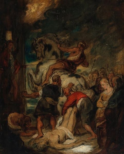 Curator: This is Henri Fantin-Latour's "Hommage À Eugène Delacroix," painted in 1864. The work in oil presents a fascinating glimpse into artistic appreciation and the community surrounding Delacroix after his death. Editor: It's remarkably dark, almost somber. A feeling of profound respect emanates from the brushstrokes, but it’s also… blurry? Not the crisp detail one might expect in a painting of homage. Curator: Yes, and that very handling of the paint interests me. See how Fantin-Latour builds form with layers of scumbled pigment, particularly in the draped clothing and the backdrop. He’s clearly working to render the figures and symbolic elements through the materiality of the paint itself. Editor: Right. But that blurriness seems intentional. The focus isn't just on celebrating Delacroix. I read this as Fantin-Latour acknowledging the very male, very elite world that centered on artistic genius at the time. Notice how all the figures present appear to be white males of some note. Curator: True, you see this acknowledgement specifically with those dressed in black in the front? They blend together quite harmoniously. The conscious design emphasizes the shared positionality of its patrons. Editor: Exactly! The symbolic addition of the allegorical figure of Fame crowning Delacroix's bust brings up so many layers. Who gets to write history, who gets remembered, and on whose terms. There is that white, male dominated art world literally blowing its own horn. Curator: Furthermore, considering the materiality here, you can notice that the act of painting such works can act to build that "art world". What resources must be involved? Editor: So much power in dictating taste. The oil paints themselves were expensive commodities back then and even now. There are clear lines that tie material and artistic labor. Curator: Delacroix, an artistic legend, becomes not just a figure of Romantic genius but also an opportunity for artists such as Fantin-Latour and his circle to define their place in an artistic, but socially shaped hierarchy. Editor: Ultimately, despite what looks at first blush as purely an act of appreciation, looking closer we uncover its historical and sociopolitical complexity as this work questions established canons in ways we can even start relating to modern gender and race theory. Curator: Indeed! Thinking of Fantin-Latour’s choices concerning pigment and composition lets us question its function as an important act that defines the social standing and conditions present to many members within that very artistic circle, solidifying the myth that constitutes this era's art.