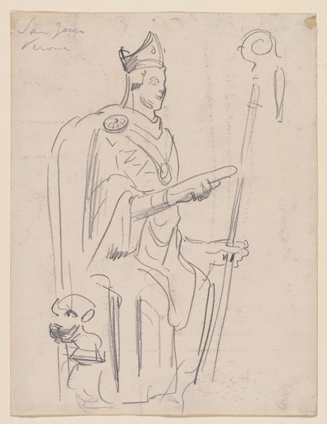 Curator: Sargent's sketch, "Frontal View of a Statue of a Seated Bishop, San Zenone, Verona," captures a moment of artistic exploration. Notice the economical use of line. Editor: It's a bit stark, isn't it? All those greys. But I see a quiet confidence in the bishop’s gaze, and the sketched lines create a sense of weight. Curator: Indeed. And this study, along with the mosaic inscription on the verso, speaks to Sargent's engagement with religious iconography and Italian art history. It was likely part of a larger project of documentation. Editor: For me, the composition is key. The placement of the hand gesture—it almost feels like a separate study hovering above. It’s unfinished, yet complete in its suggestion. Curator: Sargent's quick impressions reveal not just the image but also the context that these statues have in the city. Editor: It’s a striking reminder of how sketches can distill the essence of a subject. Curator: Absolutely, and a vital part of understanding his artistic process.