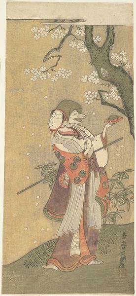 Ippitsusai Bunchō made this woodblock print depicting a scene from the popular drama "The Thousand Cherry Trees" in Japan during the late 18th century. The print captures a moment of performance, and in doing so, it speaks volumes about the cultural institutions that shaped artistic expression at the time. Woodblock prints were not merely artistic creations but commercial products, reflecting the tastes and interests of a broad urban audience. The subject matter here derives from the Kabuki theatre, a dominant institution in Japanese art. The figure of the fox woman is both fantastical and grounded in the conventions of Kabuki, where male actors play female roles and where elaborate costumes and makeup create striking visual spectacles. The cherry blossoms, symbols of spring and renewal, situate the scene within a seasonal context, common in Japanese art. To truly appreciate this print, we need to consider the social and economic forces that sustained both the Kabuki theatre and the production of woodblock prints. We can explore playbills, theatre records, and art market data. These resources can give us a clearer understanding of the cultural landscape in which this image was created and consumed.