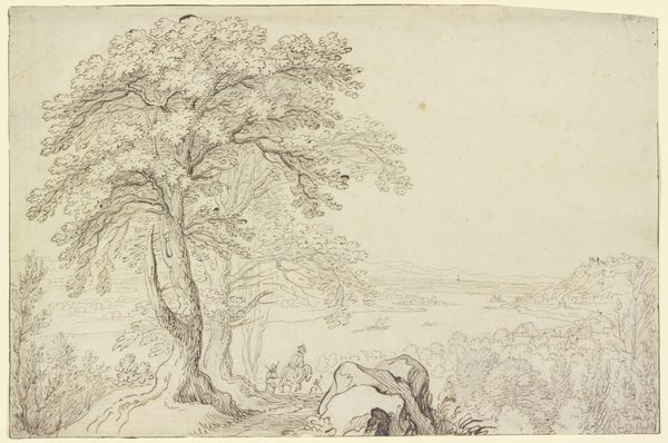 Editor: This etching by Alphonse Legros, titled "Remembrance of a Valley in Bourgogne," shows a serene landscape with two figures. It feels intimate, almost nostalgic. What aspects of this work stand out to you? Curator: The power of this piece lies in how Legros uses a seemingly simple landscape to comment on broader social issues of his time. Realism, as a movement, was invested in depicting the lives of everyday people and rural settings. Given this was etched by Legros, a man known to champion ordinary rural labor, and his eventual career teaching etching in Britain to many social realists, how might the scene speak to issues of rural life in France or Britain? Editor: Well, I see two figures – a seated child under a tree, and an adult, maybe a farmer, resting further away, both facing out towards the valley. Are they meant to be symbols or representations of specific groups in society? Curator: Precisely! The rural landscape became a battleground for artistic representation tied to ideas of national identity and social change. Think about the burgeoning Industrial Revolution at this time and its profound effect on land ownership, property rights, agricultural labour, and the social status of these country farmers in Legros' artistic network in Britain, and Bourgogne in France, itself. Legros seems to suggest that there's an undeniable connection between ordinary rural lives and national identity, which is mediated by art. What does it mean, then, that they sit to be painted by him? Editor: It highlights their importance, elevating them beyond just laborers. I never thought a landscape could have such a strong socio-political message. Curator: Exactly. It urges us to consider the social forces that influence how landscapes are seen, valued, and depicted within art history, both inside and outside the frame. I've found myself really engaged in this relationship. Editor: I feel more confident now that the scene speaks beyond face value.